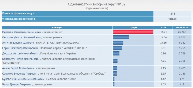 За Александра Пресмана проголосовали 25467 избирателей (42,54%). Второе место занял самовыдвиженец Дмитрий Пеструев (16,34%), третье — кандидат от Блока Петра Порошенко Валерий Алтунин (10,66%).