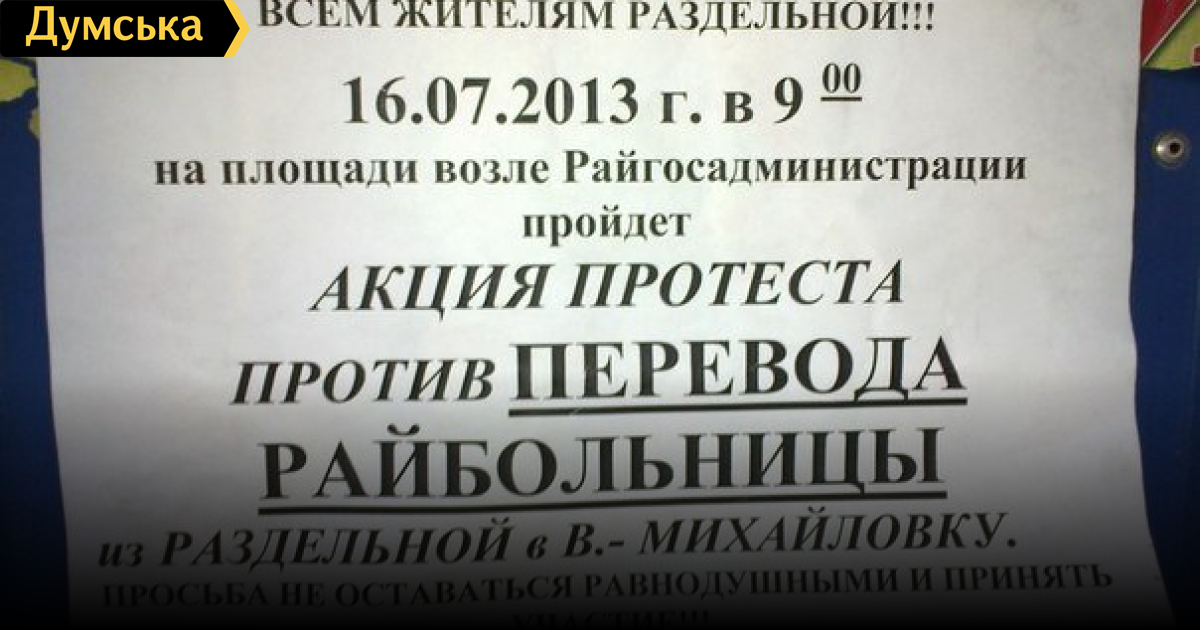 В Раздельной собирают митинг против переноса районной больницы: в РГА называют это провокациейНа днях в СМИ появилась информация о том, что 16 июля в городе Раздельная Одесской области на площади перед райгосадминистрацией состоится акция протеста против переноса районной больницы в Великомихайловку. Организаторы акции даже выпустили листовки с призывом к горожанам прийти на митинг и не допустить переноса больницы. В то же время глава Раздельнянской райгосадминистрации Олег Кураков сообщил «Думской», что эта акция является провокацией, за которой стоит главврач больницы. «Это провокация главврача ЦРБ Игоря Бычкова. У него заканчивается рабочий контракт, и его продолжать мы не намерены. Уже есть уголовное дело за взятку, которое находится в прокуратуре. Врач пытается всеми силами удержаться на посту, пытаясь сорвать сессию, дезинформируя население информацией о переносе райбольницы. На самом деле, у нас даже не стоит вопрос о ее какой-либо реорганизации», — заявил глава РГА. СМЕРТЬ РОСІЙСЬКИМ ОКУПАНТАМ! Помітили помилку? Виділяйте слова з помилкою та натискайте control-enter |