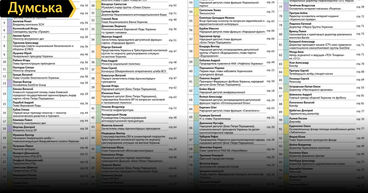 Какое-то нечеткое разделение: 85 Лозница, режиссер — синий 25 Сенцов, режиссер — желтый 90 Лынив, дирижер — синий 97 Жадан, писатель — желтый. Дальше: 64 Березюк, нардеп — оранжевый, 62 Бойко, нардеп — синий. Более-менее понятно, фиолетовый — бизнес.