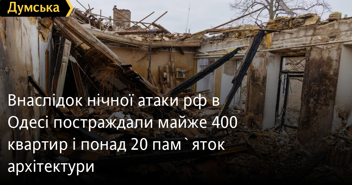 Внаслідок нічної атаки рф в Одесі постраждали майже 400 квартир і понад 20 пам`яток архітектуриПам'ятки архітектури та містобудування, історії місцевого значення постраждали внаслідок нічного удару ворога по Одесі. Як повідомили у пресслужбі Міністерства культури та стратегічних комунікацій, до переліку увійшли: - будівля технологічного інституту, в якій під час оборони Одеси утримувався загін моряків-розвідників Одеського оборонного району (1936-1938, арх. Мінкус А.Б.); - будівля Рішельєвського ліцею (Новоросійського університету) (1852-1857, арх. Шашин А.С.); - житловий будинок Заріфі (1840-ті, 1851, арх. Черкунов М.М., Моранді Ф.І.); - житловий будинок і флігель Ковалевського, в якому жив Вериго Б.Ф. — фізик, професор (1846 р., кін. XIX ст., арх. Даллаква К.І., Шашин А.С.); - житловий будинок Машевського, в якому народився Коптюх А.І. (1850-1860, арх. Гонсіоровський Ф.В.); - прибутковий будинок Толстого (1880, арх. Гонсіоровський Ф.В.); - прибутковий будинок Латрі (I пол. XIX ст.); - прибутковий будинок (кін. XIX ст.), у якому жив Малишевський В.М. — польський композитор, диригент і педагог; - прибутковий будинок Міхельсона (1890, арх. Влодек Л.Л.); - прибутковий будинок (1901, арх. Токарєв П.Д.); - будинок гуртожитку (поч. ХХ ст., арх. Чернігів Л.М.) (правоворотна споруда); - житловий будинок Вургафта, у якому жив Ямпольський С. М. - економіст, засновник факультету радіоелектроніки Одеського політехнічного інституту (1845, арх. Козлов І. С.); - житловий будинок, у якому мешкали: Ланге М. М. - психолог; Бурксер Е. С. - хімік-неорганік і геохімік; Бобинін М. М. - математик (1845, арх. Козлов І. С.); - будівля фізико-хімічного інституту Новоросійського університету (1897-1899, арх. Толвінський М.К.); - житловий будинок Інбера (готель «Савой») (1870-ті, арх. Влодек Л. Л.); - житловий будинок Рінк-Вагнера (1881, арх. Вейтко А.К.); - прибутковий будинок Весле (1881, арх. Мазиров Д.Є.); - прибутковий будинок Леонарді (1913, арх. Прохаска В.І.); - адміністративна будівля (у складі комплексу «Млин Вейнштейна») (1888-1890); - будівля училища Вейнштейна (у складі комплексу «Млин Вейнштейна») (1896); - пам'ятка історії місцевого значення: Будинок Дур'яна (готель «Вікторія» з паровою пекарнею). Тим часом у пресслужбі мерії Одеси зазначили, що станом на 17:00 у місті постраждало майже 400 квартир: - у Приморському районі — 295 квартир у 35 будинках; — у Хаджибейському районі — 79 квартир у 8 будинках; — у Пересипському районі — 18 квартир у 5 будинках. У Хаджибейському і Приморському районах обхід квартир ще триває. Там додали, що людям, чиє житло пошкоджено внаслідок атак рф, із бюджету міста надають адресну матеріальну допомогу на встановлення нових склопакетів і вхідних дверей. Станом на 1 листопада за 2023 і 2024 роки матеріальну допомогу отримали 2253 особи на суму 67,5 млн гривень. СМЕРТЬ РОСІЙСЬКИМ ОКУПАНТАМ! Помітили помилку? Виділяйте слова з помилкою та натискайте control-enter Новини по цій темі: 1 січня: Нічний удар по Одещині: пошкоджено енергетичну інфраструктуру та житлові будинки (фото, відео) 31 грудня 2025: Новорічний наліт: Одеса під ударом російських шахедів 25 грудня 2025: Ворог вночі атакував Одеську область: одна людина загинула, двоє отримали поранення (фото) 23 грудня 2025: Ворог атакував південь Одещини: пошкоджено суховантаж, приватні будинки та енергооб'єкт (фото) 22 грудня 2025: Ворог вночі атакував Одесу: постраждав чоловік, частина Пересипського району залишилася без світла |