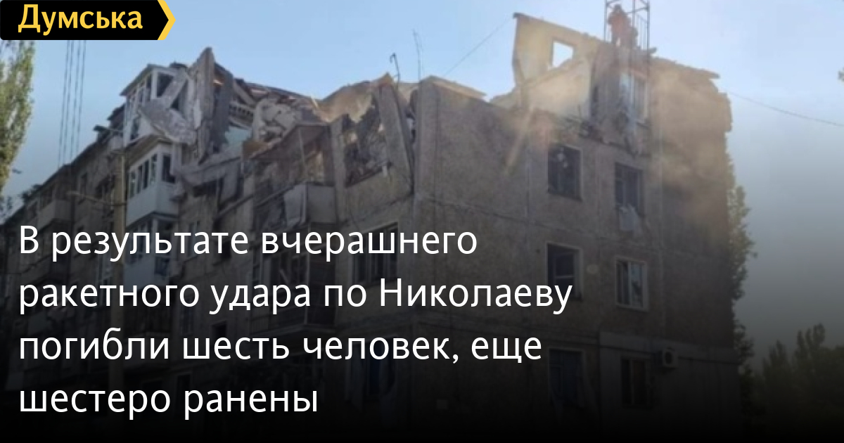В результате вчерашнего утреннего обстрела Николаева, когда оккупанты выпустили по городу более десяти ракет, погибли шесть человек, и еще шестеро получили ранения.