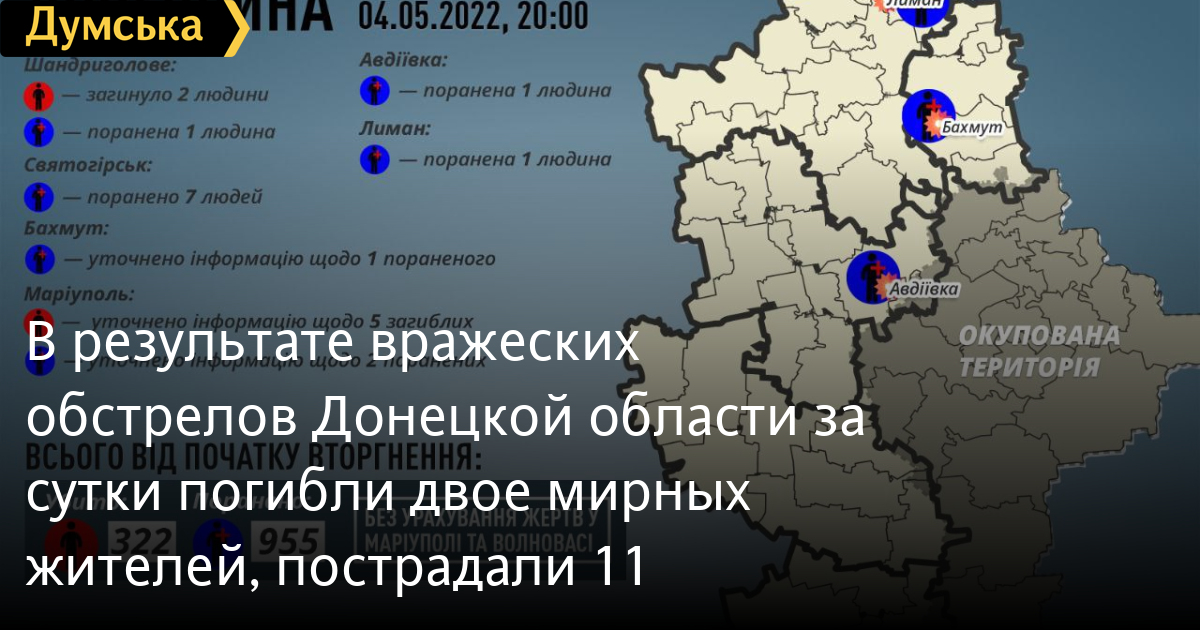 Два человека погибли и 11 пострадали в результате обстрела оккупантами населенных пунктов Донецкой области 4 мая.