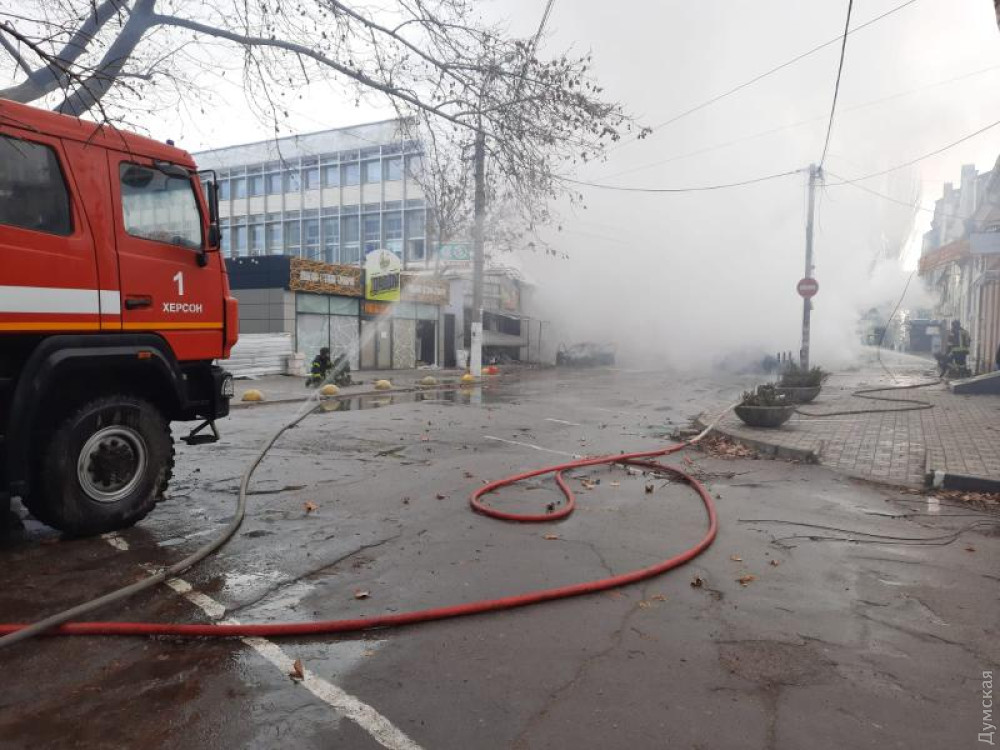 У ДСНС повідомили, що в центрі Херсона горіли шість машин і кіоск на ринку. На місці працювали 20 пожежників і чотири спецмашини.