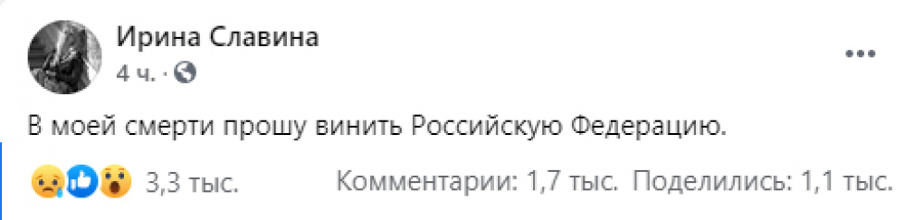 В Нижнем Новгороде главный редактор интернет-издания «Коза Пресс» Ирина Славина подожгла себя около здания МВД. Об этом сообщил Telegram-канал Baza. Перед этим женщина разместила у себя в Фейсбуке пост следующего содержания: «В моей смерти прошу винить Российскую Федерацию». Ирина Славина скончалась на месте. Днем ранее она сообщила, что у нее дома прошел обыск. СМЕРТЬ РОССИЙСКИМ ОККУПАНТАМ! Заметили ошибку? Выделяйте слова с ошибкой и нажимайте control-enter |