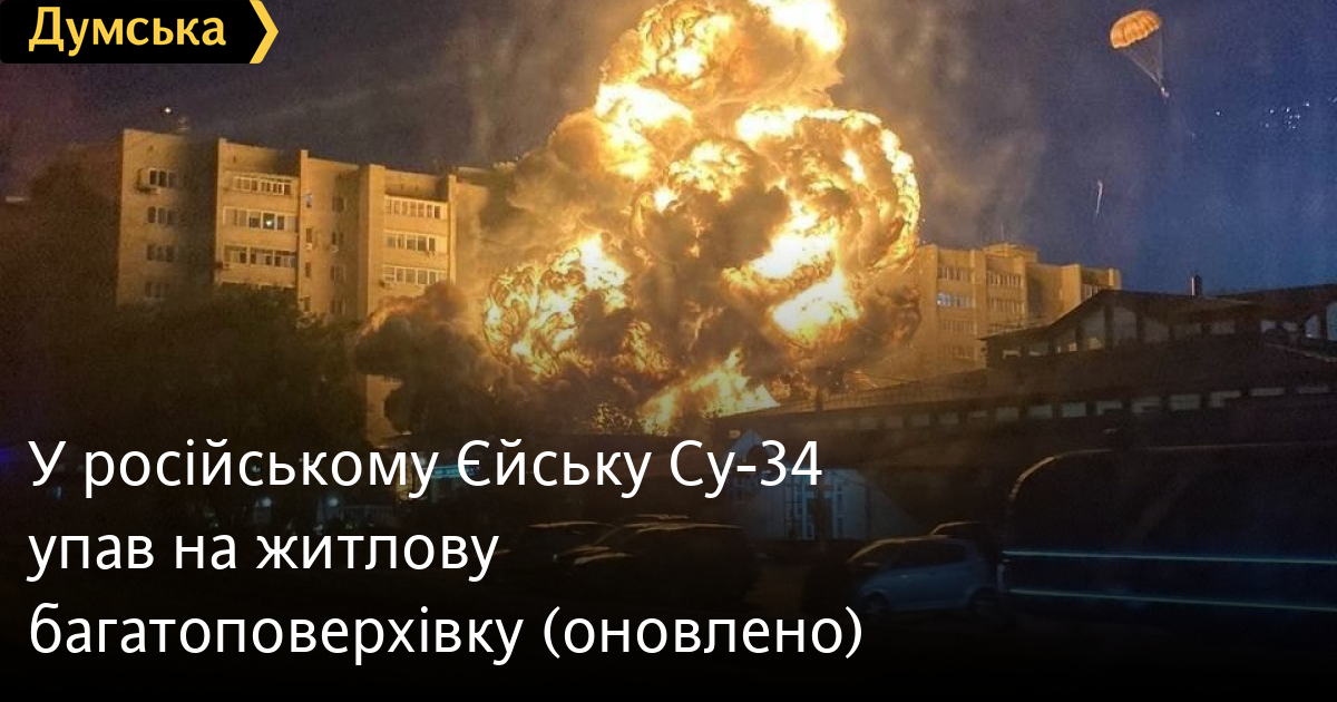 Військовий літак Су-34 впав на житловий будинок у російському місті Єйськ.