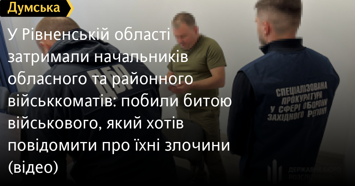 У Рівненській області затримали начальників обласного та районного військкоматів: побили битою військового, який хотів повідомити про їхні злочини (відео)Правоохоронці затримали голову Рівненського обласного територіального центру комплектації та соцпідтримки, а також голову одного з районних військкоматів за побиття військовослужбовця битою. Про це повідомили в Держбюро розслідувань. Раніше в мережі з'явилося відео, на якому обласний воєнком б'є солдата битою за те, що той вирішив повідомити правоохоронцям про скоєні чиновником злочини. Голова обласного ТЦК знімав знущання на відео — солдата змушували на колінах просити пробачення. Під час проведених обшуків в обласного військкома вдома знайшли ту саму биту, а в його підлеглого — вісім пакунків із білою речовиною, імовірно, амфетаміном, а також пристрої для вживання наркотиків. Районному воєнкому оголосили підозру в незаконному зберіганні наркотиків (ст. 307 Кримінального кодексу України), а обласному воєнкому — у перевищенні посадових повноважень (ст. 426-1 КК). Помітили помилку? Виділяйте слова з помилкою та натискайте control-enter |