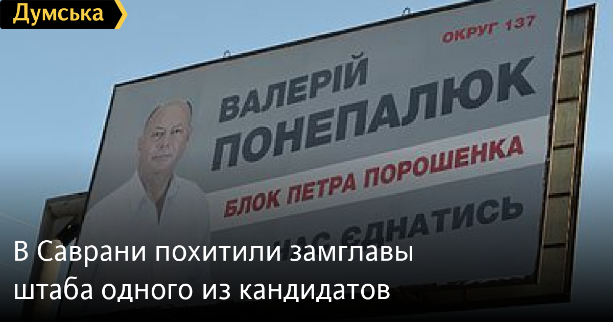 В райцентре Саврань Одесской области неизвестные похитили заместителя председателя штаба кандидата от Блока Петра Порошенко по 137 округу Валерия Понепалюка — Владимира Бондарчука. Как сообщили в штабе Понепалюка, похищение произошло сегодня, 29 октября, – после того, как стало известно о том, что на целом ряде участков округа (около 30-ти) будет проведен пересчет голосов. Бондарчука вывезли в Кировоградскую область и там выбросили. «Думская» выясняет подробности произошедшего. СМЕРТЬ РОССИЙСКИМ ОККУПАНТАМ! Заметили ошибку? Выделяйте слова с ошибкой и нажимайте control-enter |