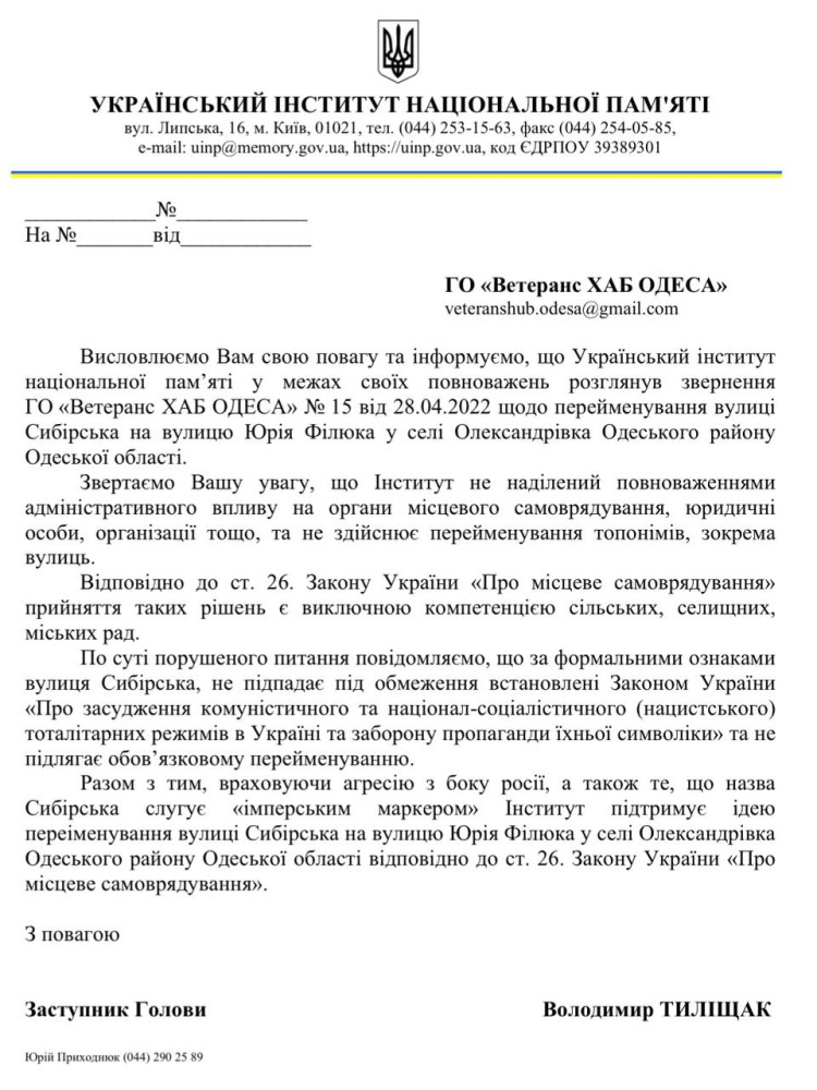 В ответе на запрос говорится, что название улицы Сибирской не подпадает под действие Закона Украины «Об осуждении коммунистического и национал-социалистического (нацистского) тоталитарных режимов в Украине и запрете пропаганды их символики» и поэтому не подлежит немедленному переименованию, однако согласились с тем, что указанное название улицы является «имперским маркером», и поддержали инициативу переименования.