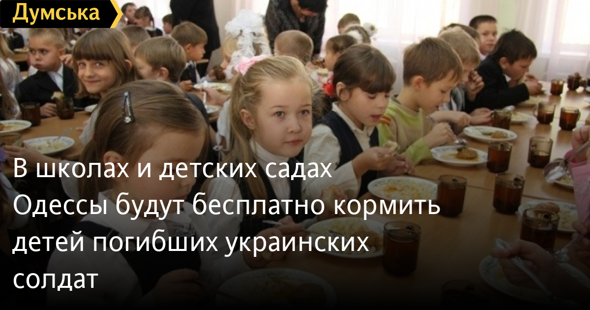 Установить бесплатное горячее питание в учебных заведениях Одессы для детей, чьи родители погибли (пропали без вести) в зоне антитеррористической операции или умерли вследствие ранений или заболеваний, полученных на фронте, предлагают исполкому Одесского горсовета.