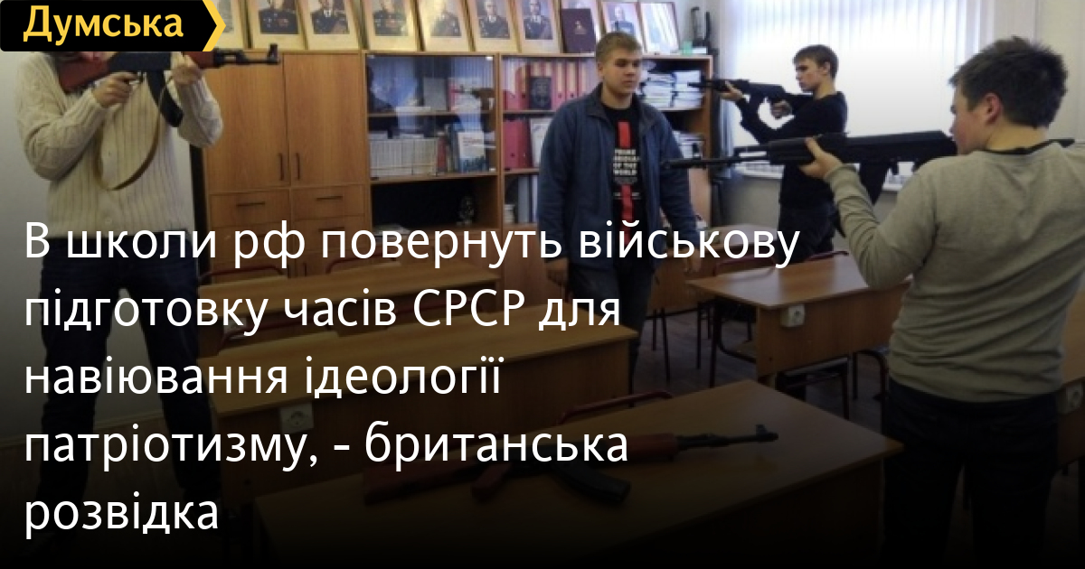 «Ці тренінги, ймовірно, мають на меті виробити в учнів військові навички, коли вони наближаються до призовного віку, а також збільшити участь у мобілізації та призовах, — наголосили у британському Міноборони. — Також ця ініціатива, ймовірно, буде частиною ширшого проекту щодо посилення навіювання російському населенню ідеології патріотизму та довіри державним інститутам».
