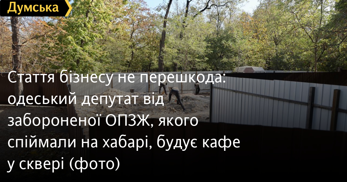 Стаття бізнесу не перешкода: одеський депутат від забороненої ОПЗЖ, якого спіймали на хабарі, будує кафе у скверіНове кафе будують у центрі скверу Старостіна, що на одеській Слобідці. Заклад виросте на місці занедбаної та напівзруйнованої будівлі, повідомляє кореспондент «Думської». За однією з версій, це колишня каплиця, що прикрашала румунський військовий цвинтар, який був тут за часів окупації. За іншою — одноповерховий будинок першої половини ХХ століття. Мешканці прилеглих будинків категорично проти будівництва кафе. Вони вважають, що в зеленій зоні куди доречніший дитячий майданчик. На вихідних вони планують провести зустріч у сквері. Кав'ярню вирішив звести депутат Одеської міської ради від забороненої партії ОПЗЖ Михайло Карпенчук, якого затримали в липні цього року за підозрою в хабарництві. За даними СБУ, він системно отримував гроші від підприємців за видачу дозволів на вирубку зелених насаджень в Одесі. До злочинної діяльності проросійський депутат залучив членів очолюваної ним комісії, а також посадових осіб комунальних підприємств і структурних підрозділів міськради. Правоохоронці затримали ОПЗЖшника після отримання ним на криптовалютний рахунок 5 тисяч доларів за видачу акта про обстеження ще одного аварійного дерева в центрі міста. Карпенчук заволодів руїнами за двома договорами дарування: у документах розвалюха фігурує як житловий будинок на дві квартири. Документів на землю в нього немає. Декларацію про початок будівництва 14 вересня 2023 року зареєстрував міський ДАБК, який очолює ще один депутат міськради від забороненої ОПЗЖ Олександр Авдєєв — керівник групи «Українська мрія», до складу якої входить Карпенчук. СМЕРТЬ РОСІЙСЬКИМ ОКУПАНТАМ! Помітили помилку? Виділяйте слова з помилкою та натискайте control-enter
