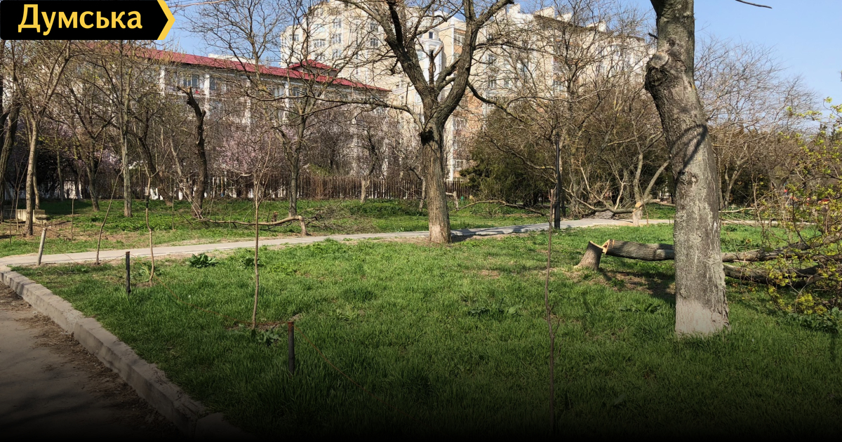Неизвестные устроили лесоповал в сквере, расположенном за клиникой МВД, между переулками Каркашадзе и Дунаева.