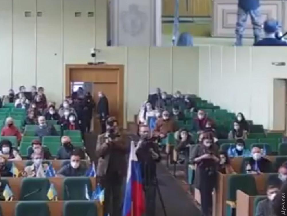 Сьогодні на засіданні Слов'янської міської ради активіст під прикриттям українського прапору виніс російський триколор, поставивши його перед собою для виступу. Дій своїх він пояснити не встиг, бо правоохоронці одразу забрали прапор і вивели його з зали. pic.twitter.com/OAGyn6SyJq— Highlander Freeman (@highlander_free) April 12, 2021