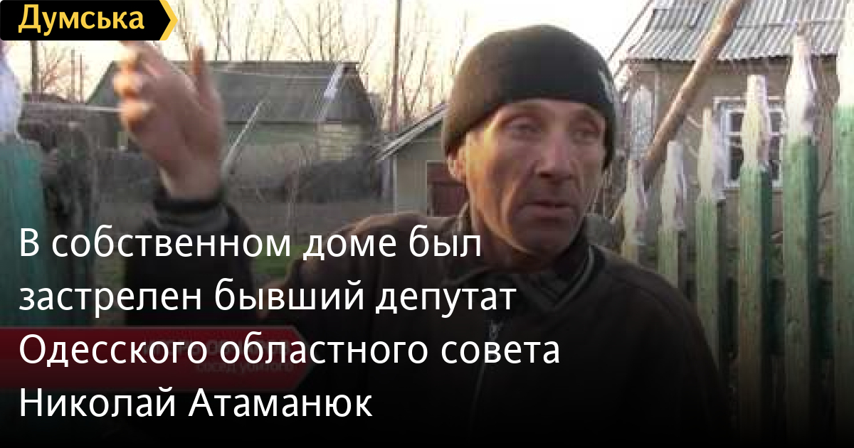 В собственном доме был застрелен бывший депутат Одесского областного совета Николай АтаманюкРезонансное убийство в Беляевке. В собственном доме был застрелен бывший депутат Одесского областного совета, бизнесмен Николай Атаманюк. Нападавший заранее продумал убийство. Он снял домик, окна которого выходят во двор предпринимателя. СМЕРТЬ РОССИЙСКИМ ОККУПАНТАМ! Заметили ошибку? Выделяйте слова с ошибкой и нажимайте control-enter Думская ТВ. Сюжеты:
