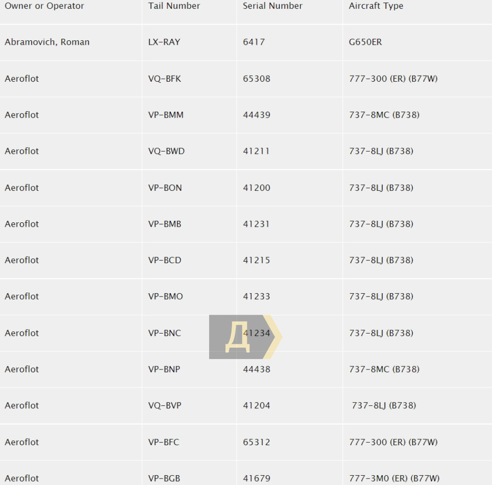 В черный список американского ведомства вошли 33 борта авиакомпании «Аэрофлот», 12 самолетов Air Bridge Cargo Airlines, 23 Azur Air, 14 Nordwind, 12 Utair, 5 «Авиастар-Ту», а также личный самолет олигарха Романа Абрамовича.