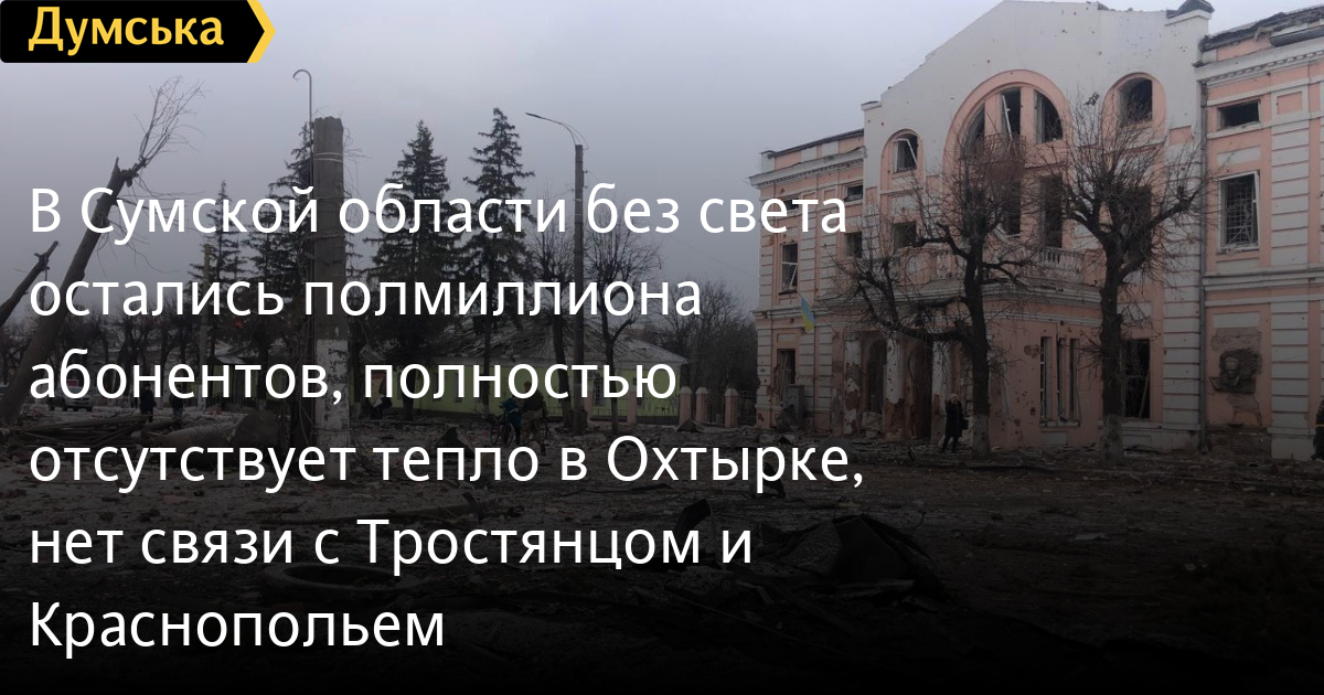 В Сумской области без света остаются более полумиллиона абонентов. Электричество отсутствует у значительной части жителей Охтырки (13 тысяч абонентов), Писаревки (8200), Тростянца (2500), Краснополья (14000).