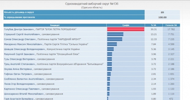 В 136 округе (Суворовский район Одессы) победил кандидат от Блока Петра Порошенко Дмитрий Голубов.