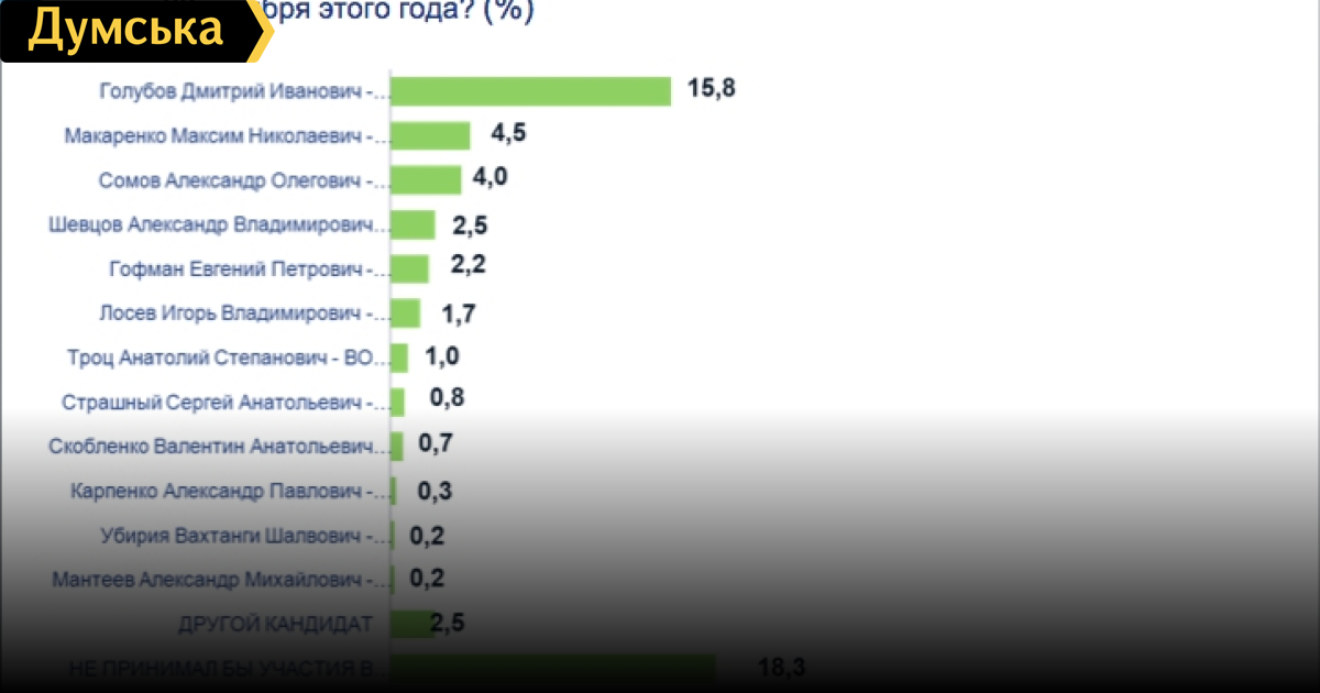 Согласно результатам опроса в 136-ом округе (Суворовский район Одессы), проведенного центром социальных и маркетинговых исследований «Социс», кандидат от Блока Петра Порошенко Дмитрий Голубов опередил своих соперников по предвыборной гонке. Так, за него собираются проголосовать 15,8% опрошенных. В то же время в пользу кандидата от «Сильной Украины» Максима Макаренко высказались 4,5% респондентов. Третье место у представителя «Народного фронда» Александру Сомову с 4%. Бывший вице-мэр, известный как «дальницкий стрелок», набрал меньше одного процента и занял место в конце рейтинга.