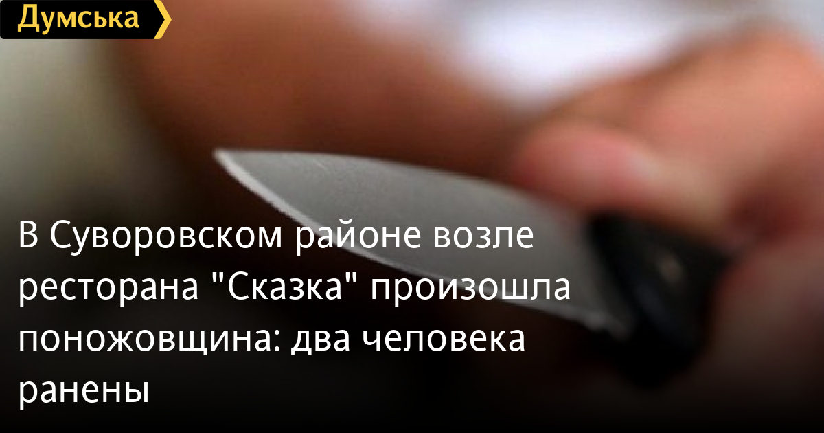 В Суворовском районе возле ресторана «Сказка» произошла поножовщина: два человека раненыДвое мужчин получили ножевые ранения в результате конфликта, который возник у них с молодым человеком возле ресторана «Сказка» на проспекте Добровольского. Как сообщили «Думской» источники в полиции, происшествие случилось вечером 17 сентября. Полицейские установили, что у двух мужчин 1968 и 1989 года рождения возник конфликт с третьим — 1994 года рождения из-за того, что последний некорректно общался с сотрудницей ресторана. В результате самый молодой участник конфликта нанес оппонентам ножевые ранения. Их госпитализировали. Одного с диагнозом проникающее ножевое ранение грудной клетки, а второго — резаная рана левого предплечья. Сейчас решается вопрос об избрании нападавшему меры пресечения. Сведения по факту произошедшего внесены в ЕРДР. СМЕРТЬ РОССИЙСКИМ ОККУПАНТАМ! Заметили ошибку? Выделяйте слова с ошибкой и нажимайте control-enter Новости по этой теме: 12 января 2022: Харьковские станции метро ожидает масштабная проверка: в вестибюле подземки на площади Конституции рухнул потолок (фото) 8 января 2022: В Одессе из офиса фирмы выкрали сейф с внушительной суммой денег, золотом и пистолетом 27 декабря 2021: В лесополосе под Киевом нашли тело главврача из Ровенской области: по подозрению в убийстве задержаны таксист с приятелем 23 декабря 2021: В Киеве задержали подозреваемых мошенников, которые обманывали на свиданиях мужчин ради денег |
