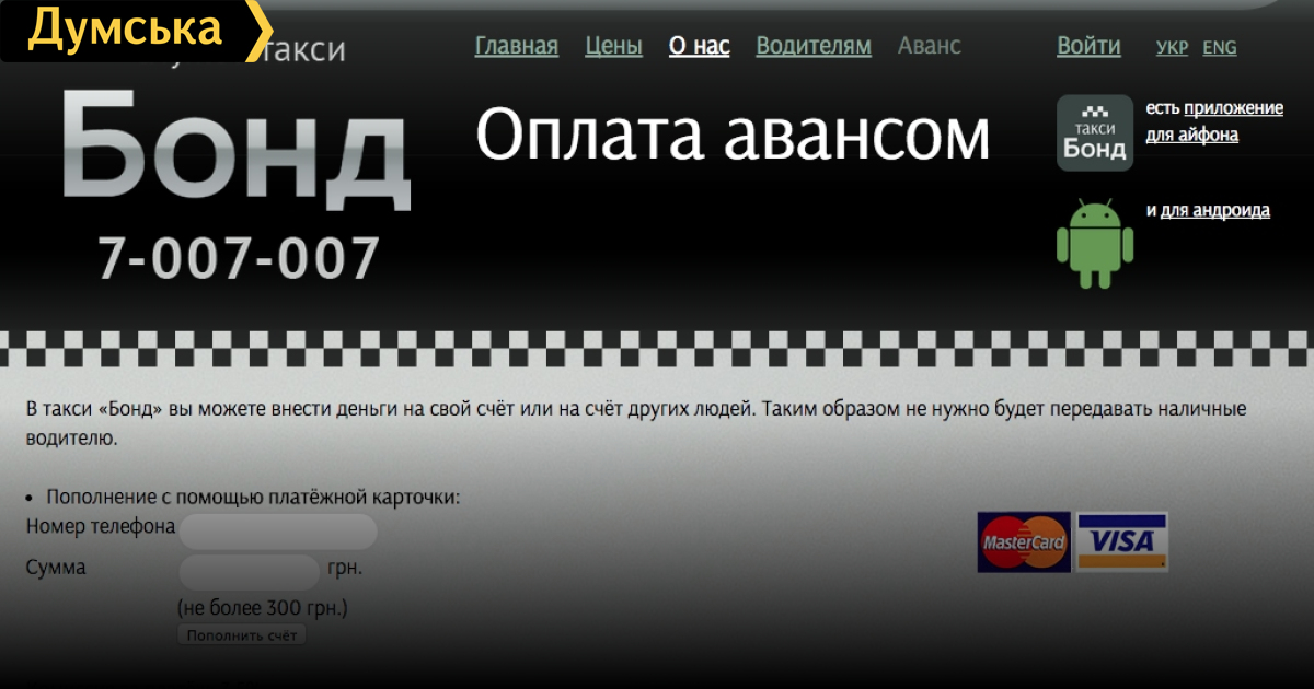 В популярном одесском такси «Бонд» введен еще один способ оплаты. Теперь свой счет можно пополнить на сайте с помощью платежной карты. После пополнения можно вызывать такси и не тратить время на расчеты с водителем. Так же можно пополнить счет не только себе, но и своим близким.