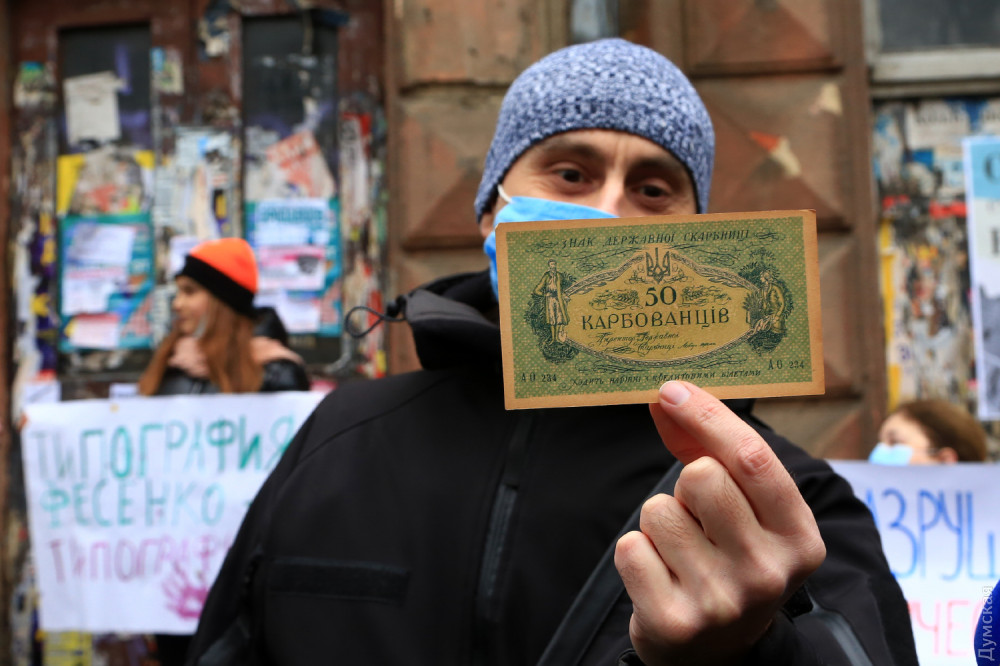 Руководитель Южного межрегионального отдела Украинского института национальной памяти, историк Сергей Гуцалюк напомнил, что в типографии Фесенко издавались первые в Одессе книги на украинском языке, а в годы Освободительной борьбы (Визвольних змагань) 1917-1922 годов предприятие печатало первые деньги независимой Украины — карбованцы Украинской Народной Республики. На митинге продемонстрировали одну такую купюру — 50 карбованцев.
