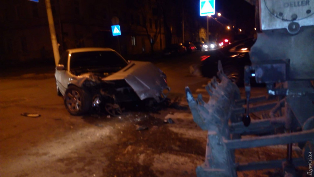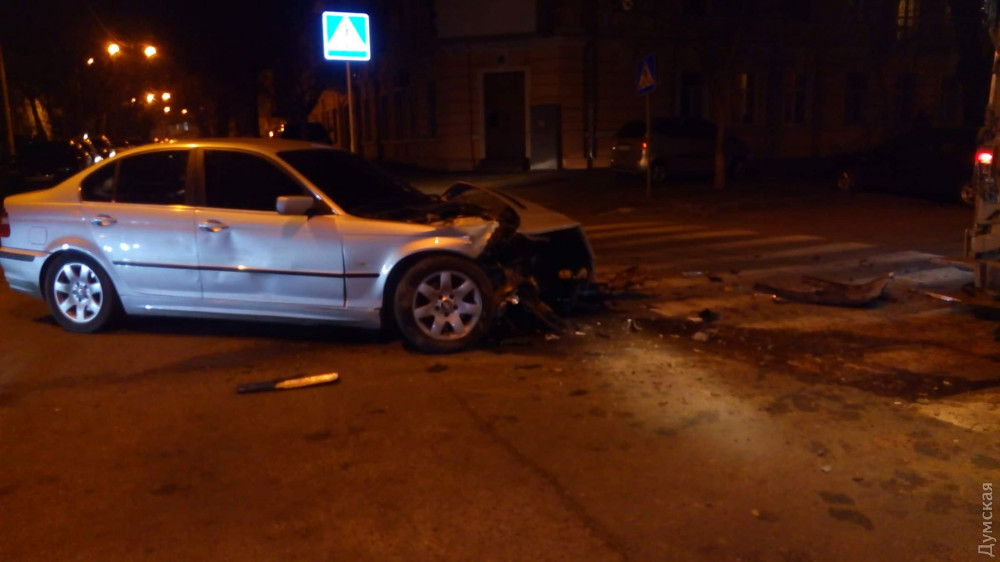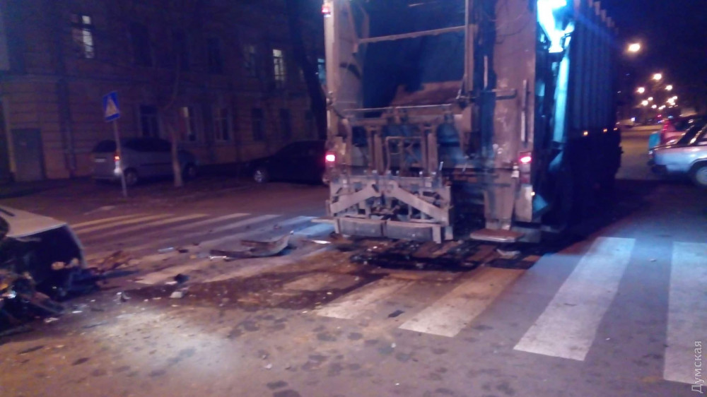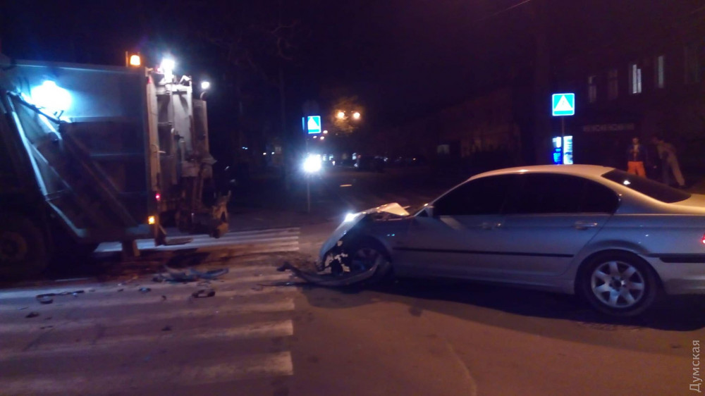 Автомобиль BMW с еврономерами врезался в мусоровоз в центре Одессы.
