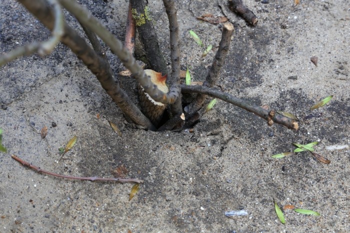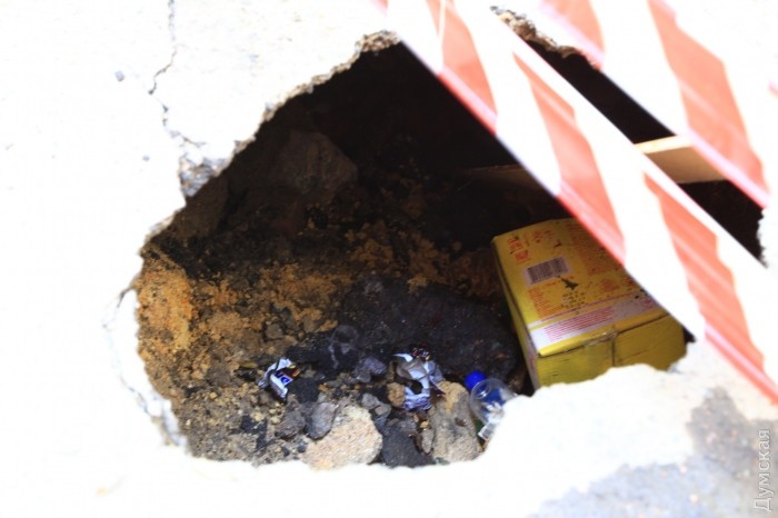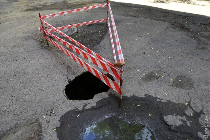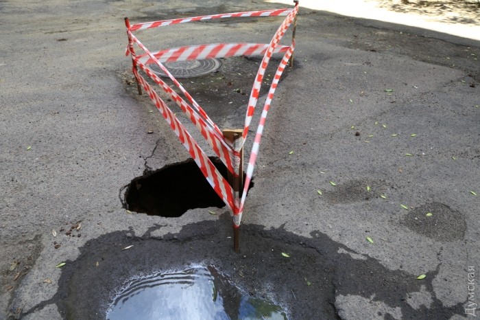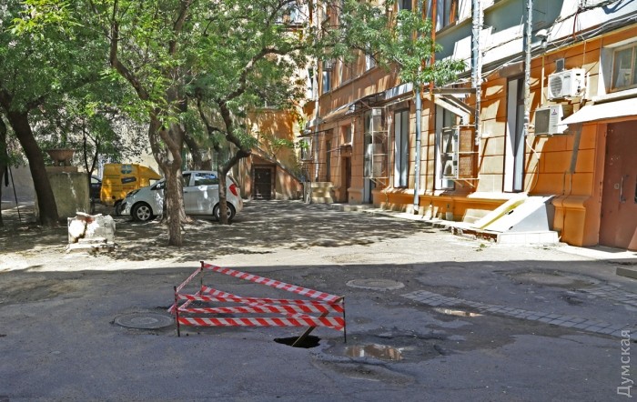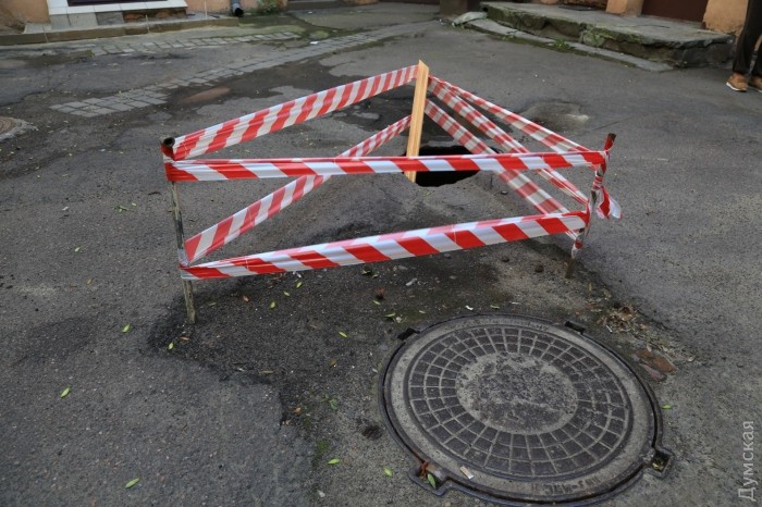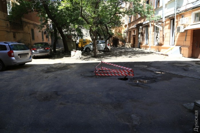 Вскоре под асфальтом в нескольких местах двора начали появляться мини-провалы, а после очередного ливня образовалось большое отверстие в асфальтовом покрытии. Прибывшие работники ЖКС не предприняли никаких мер к ликвидации последствий — они просто огородили место аварийной лентой.