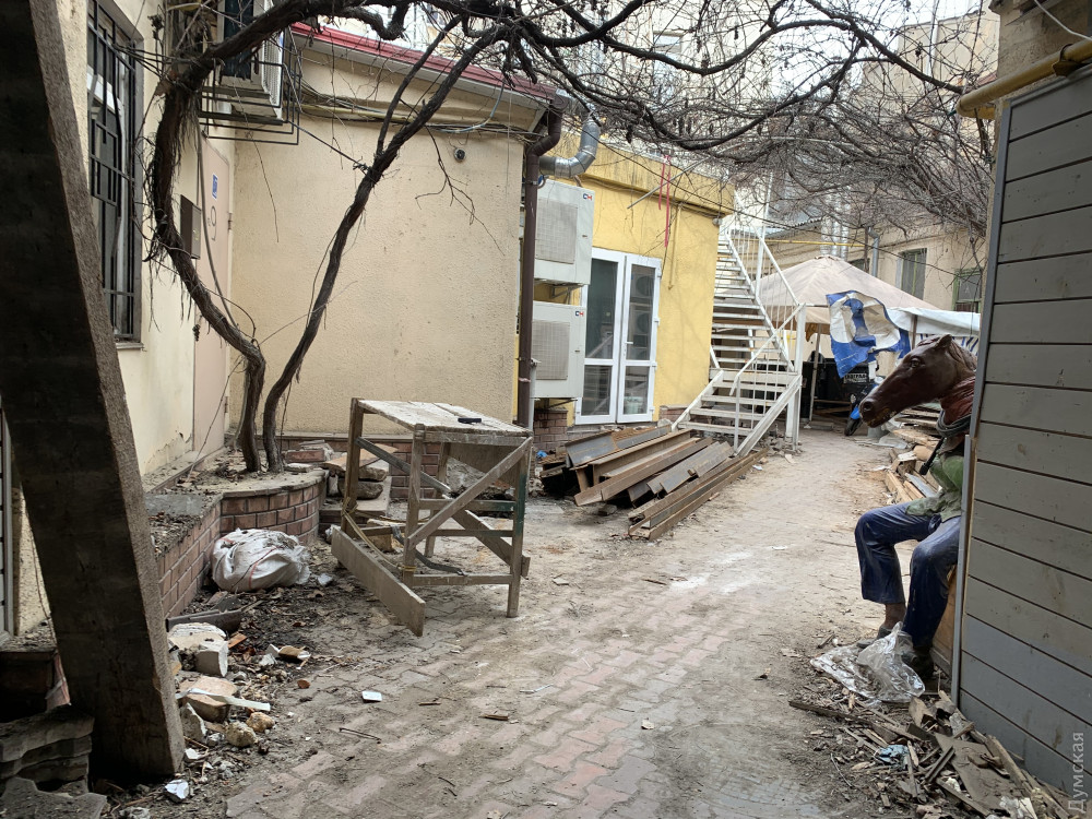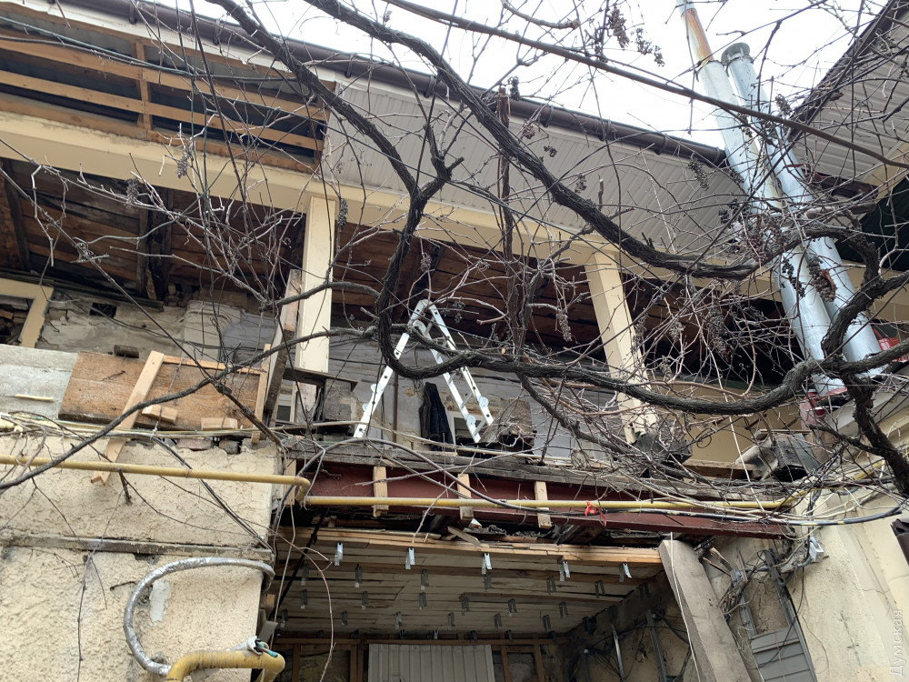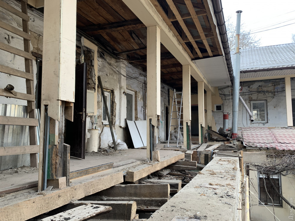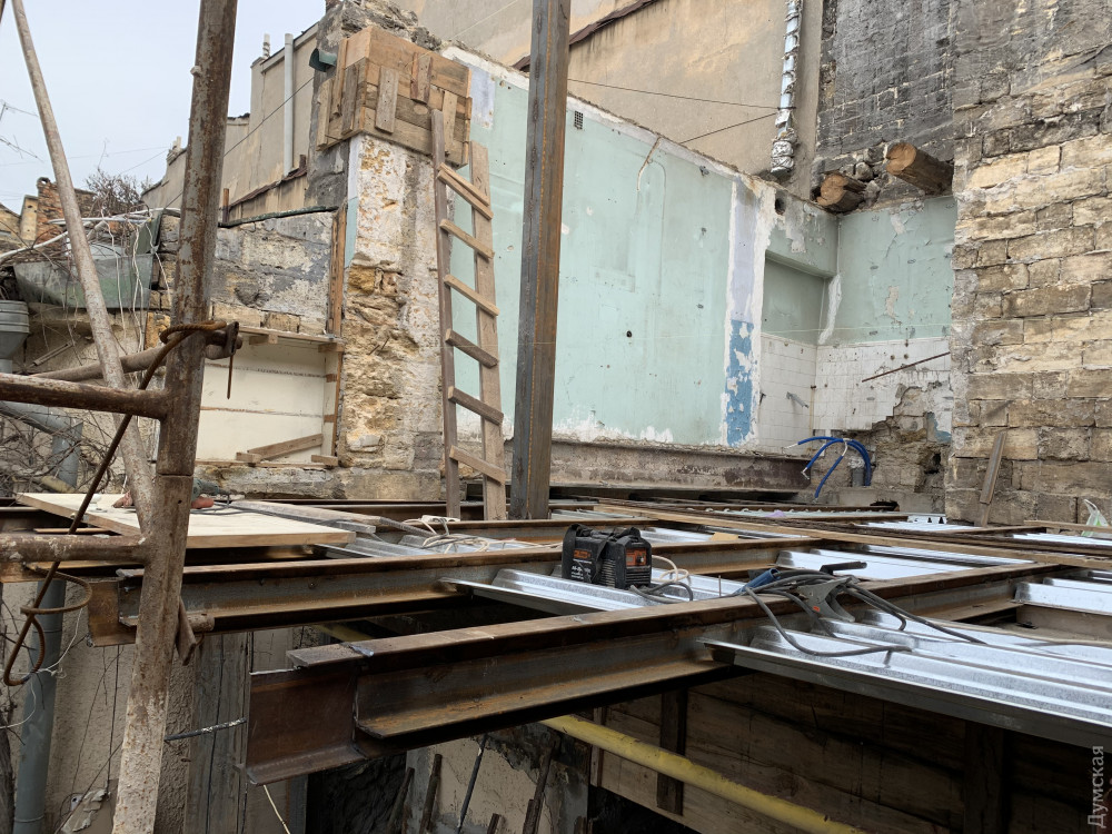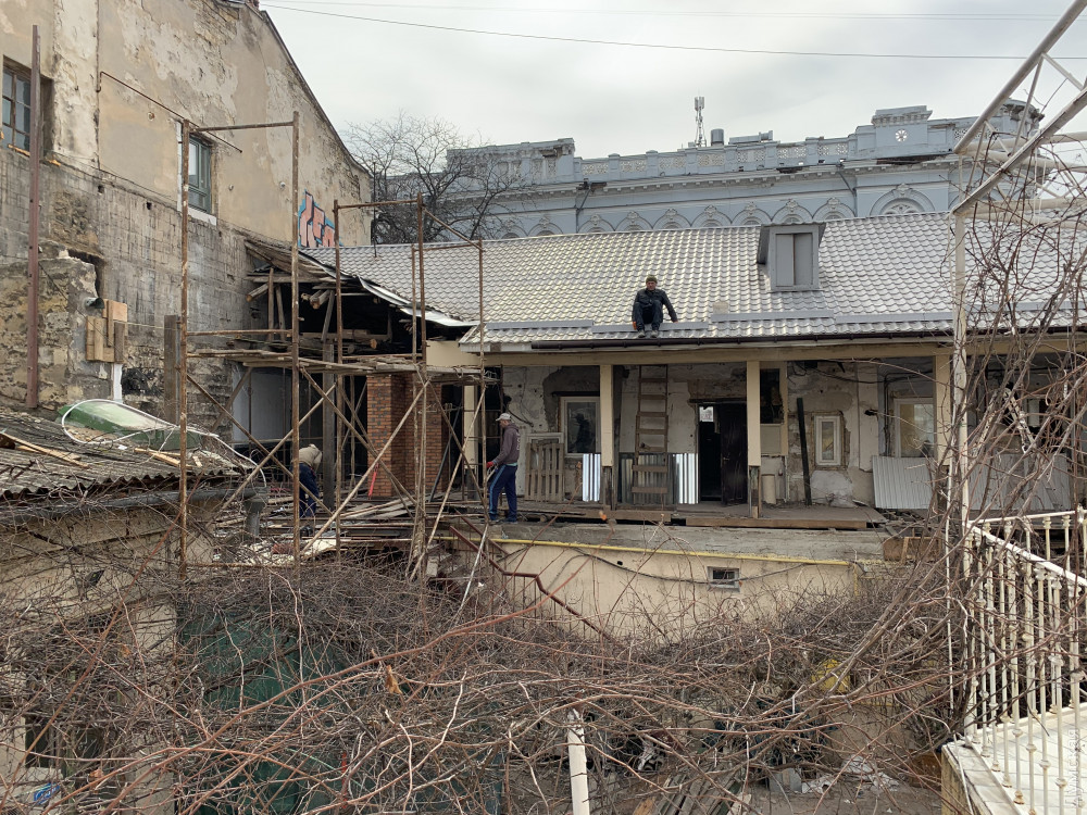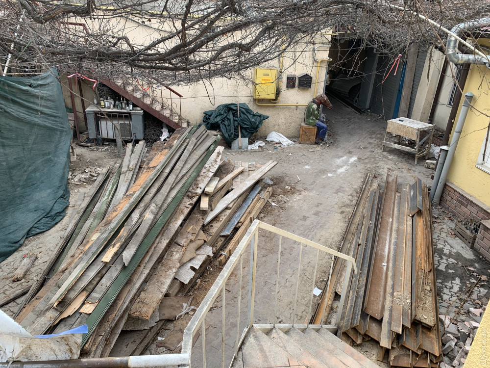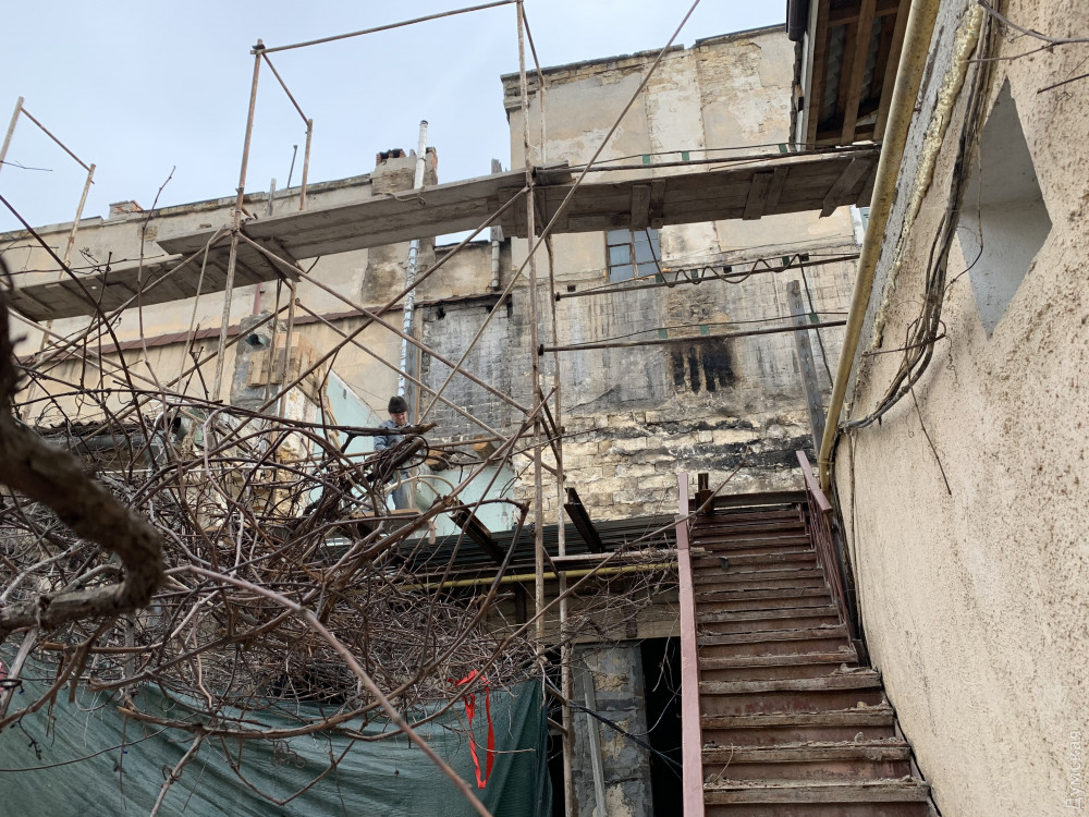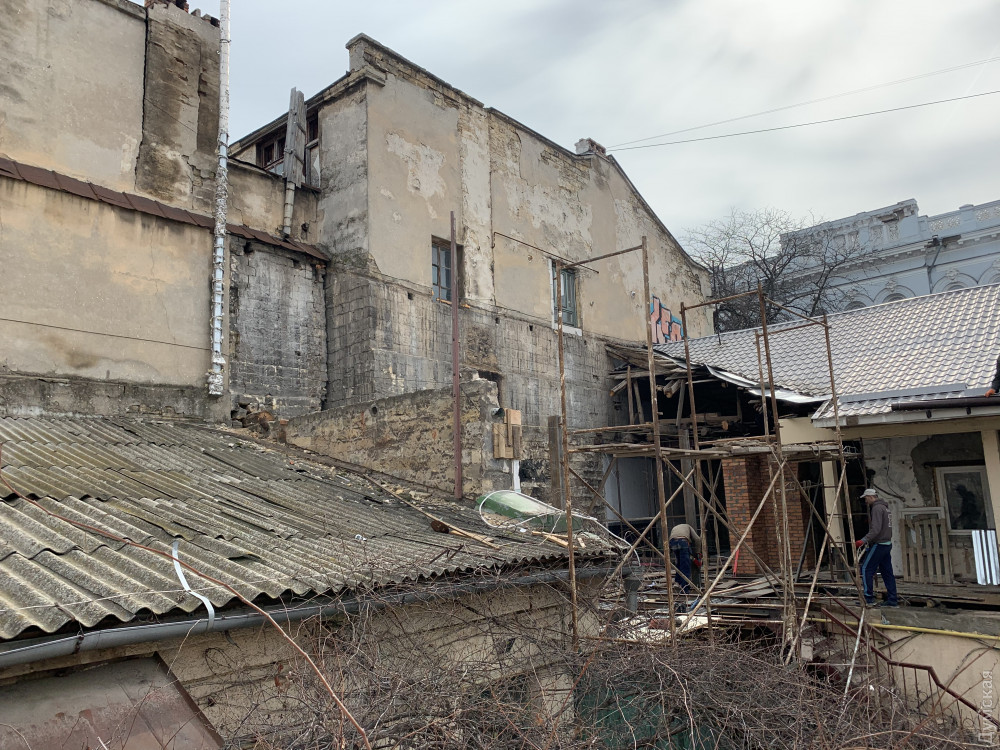 Как передает корреспондент «Думской», внутренняя часть доходного дома Халпакчи (Греческая, 32/Екатерининская, 23) буквально раскурочена. Рабочие снесли внутридворовой флигель.