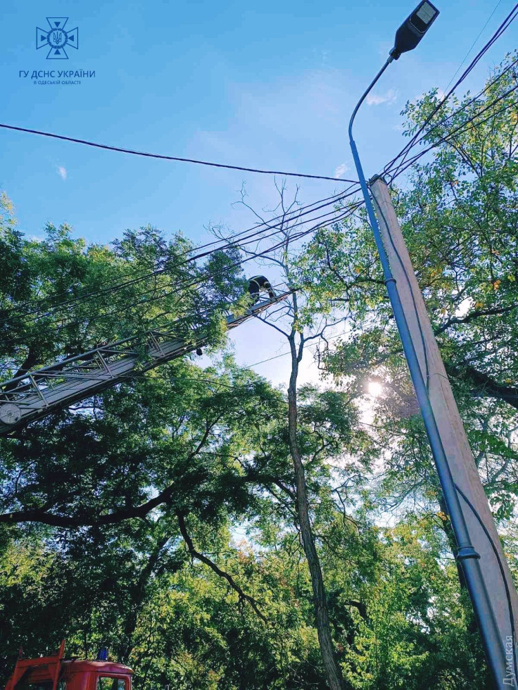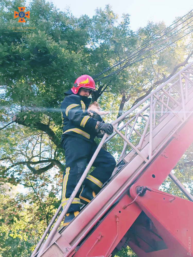 У ДСНС повідомили, що рятувальник піднявся за твариною на автодрабині.