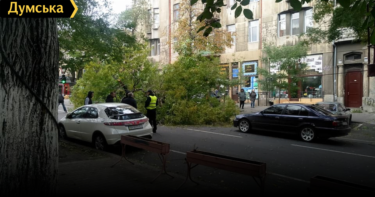 В центре Одессы упавшее дерево повредило четыре автомобиля и перекрыло дорогу