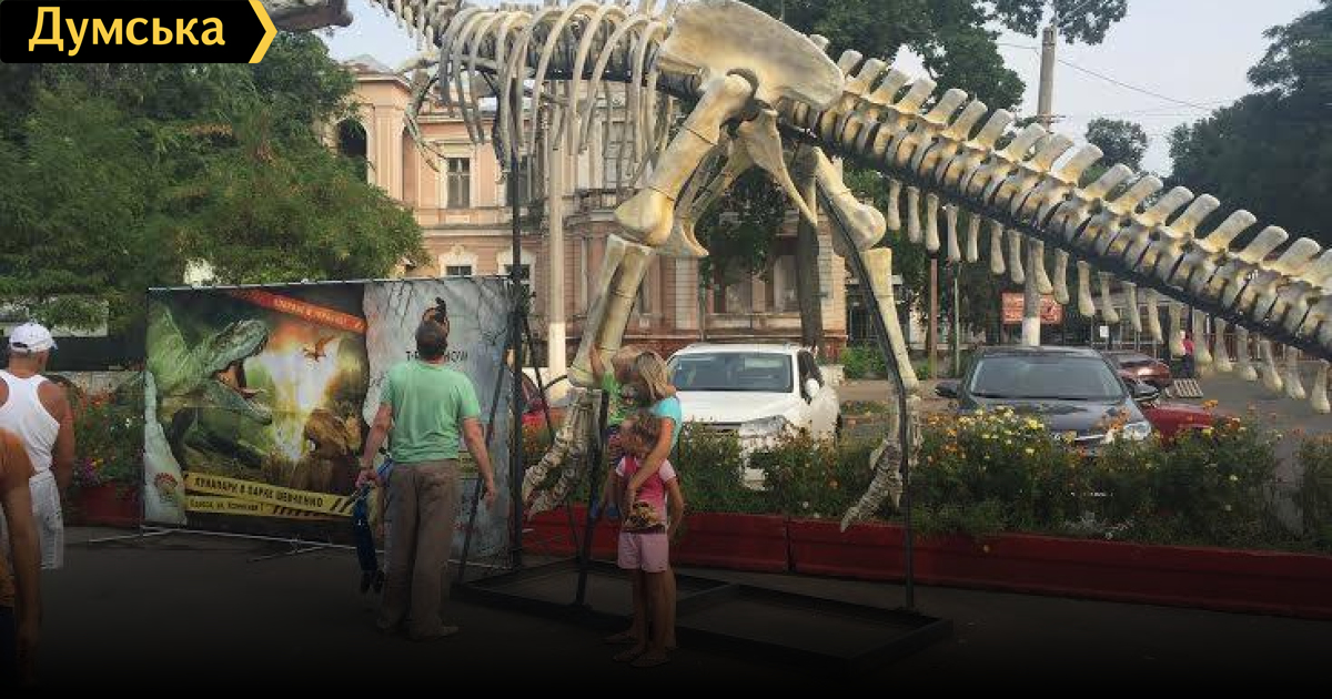 Одесситы и гости города облюбовали новую достопримечательность, появившуюся на днях в центре города: возле входа в парк Шевченко установили огромный скелет динозавра Т-рэкса. Длина макета — около десяти метров.
