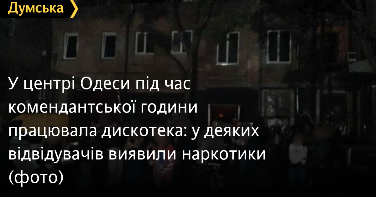 У центрі Одеси під час комендантської години працювала дискотека: у деяких відвідувачів виявили наркотикиОдеська поліція накрила дискотеку, яка незаконно працювала в закритому арт-клубі на Канатній під час комендантської години. Правоохоронці повідомили, що в кількох відвідувачів розважального заходу виявили пакунки з наркотиками рослинного і синтетичного походження. Поліцейські перервали вечірку, на якій були присутні кілька десятків людей. У клубі, зокрема, були неповнолітні у стані сп'яніння. Відкрито провадження за 309-ю статтею Кримінального кодексу України (незаконний обіг наркотиків). Із батьками підлітків провели профілактичну бесіду, також їм виписали адмінпротоколи за 164-ю статтею (невиконання обов'язків щодо виховання дітей). Поліція наполягає на розірванні договору оренди приміщення з адміністрацією клубу. Помітили помилку? Виділяйте слова з помилкою та натискайте control-enter Новини по цій темі: 29 липня 2025: В Усатово Одеської області сталася перестрілка: поліція працює на місці (відео, оновлено) 28 липня 2025: П'яний на "Ягуарі" або гіпертонік? Звільнений топ-посадовець одеської поліції хоче повернутися на службу 19 червня 2025: Дівчинку, яку шукали сотні одеситів, знайшли вбитою: поліція працює з чоловіком, ймовірно причетним до загибелі 27 травня 2025: Увели гектар в університету: на Одещині засудили земельних аферистів, але без посадки і Хвоста |