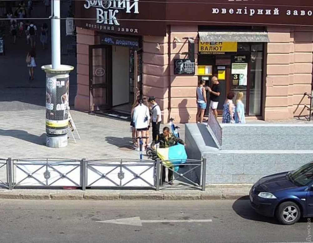 Сотрудники коммунального учреждения «Муніципальна варта» задержали мужчину, который средь бела дня срезал государственный флаг с мемориала погибшим 2 мая 2014 года Игорю Иванову и Андрею Бирюкову на перекрестке Преображенской и Дерибасовской.