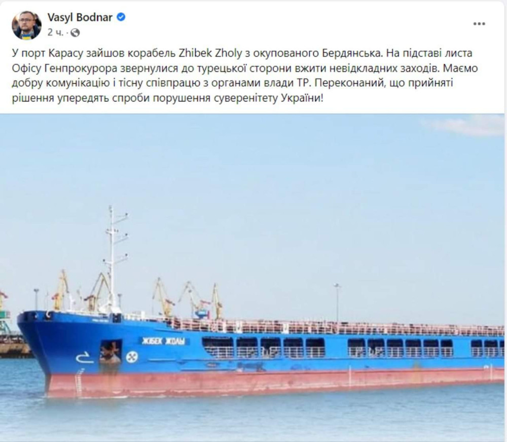 Речь идет о грузовозе Zhibek Zholy («Жибек Жолы»), который принадлежит казахстанской компании KTZ Express, однако был взят в аренду российской компанией. Ранее сообщалось, что судно вышло из порта оккупированного Бердянска и перевозило 7 тысяч тонн груза.