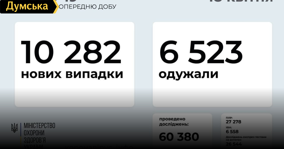 17 апреля число инфицированных коронавирусом жителей Украины увеличилось на 10282 человека (1946510 с начала пандемии). По данным Министерства здравоохранения, самые высокие темпы распространения «ковида» за минувшие сутки в Харьковской области – 1590 новых заболевших. 250 пациентов вчера скончались от осложнений «ковида» (39768). 39 смертей в Днепропетровской области, 35 в Харьковской, а в Одесской, Запорожской и Черкасской областях было без летальных исходов. 6523 человека вчера вылечились от «ковида» (1482079). Больше всего – 790 – в Харьковской области. Вчера вакцины от коронавируса получили 3333 человек (449192 за все время). СМЕРТЬ РОСІЙСЬКИМ ОКУПАНТАМ! Помітили помилку? Виділяйте слова з помилкою та натискайте control-enter Новини по цій темі: 4 березня 2023: "Вакцини-довгожителі", або Як щеплення проти COVID-19 перетворилися в Україні на небезпечний ритуал 27 січня 2023: МОЗ зобов`язали опублікувати договори на закупівлю вакцин проти COVID-19: апеляційний суд задовольнив позов журналіста "Думської" 11 січня 2023: За тиждень в Одесі зафіксовано 159 випадків ковіду 4 січня 2023: За тиждень в Одесі зареєстровано 113 випадків ковіду |