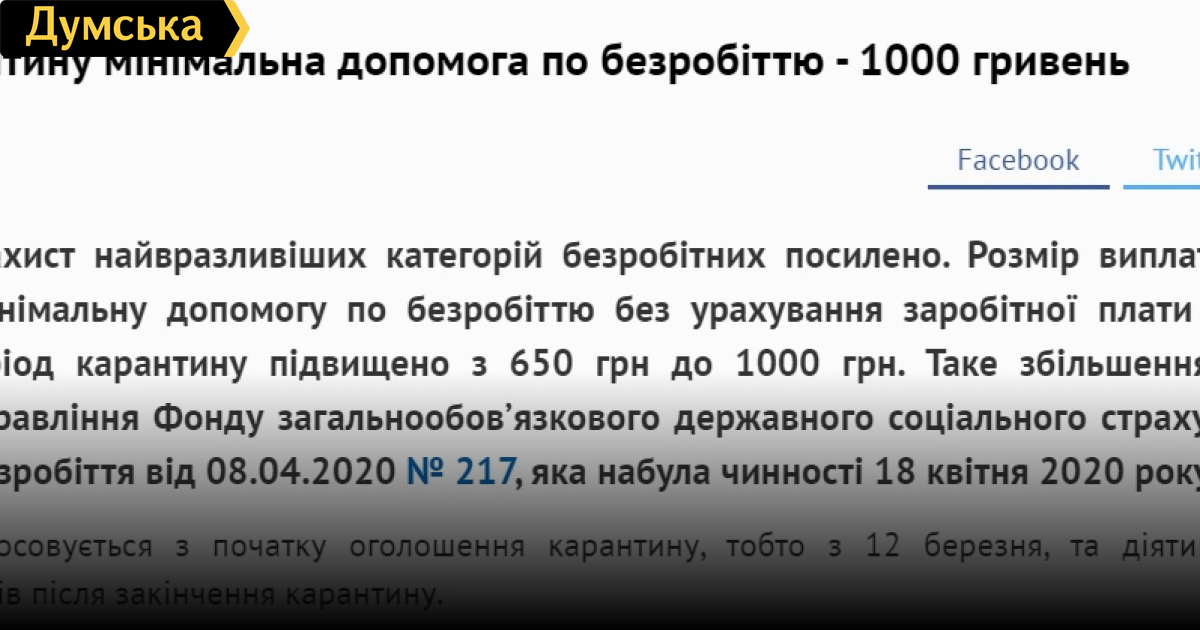 Размер выплат для лиц, получающих минимальную помощь по безработице без учета заработной платы и страхового стажа, на период карантина повышен с 650 аж до 1 тысячи гривен