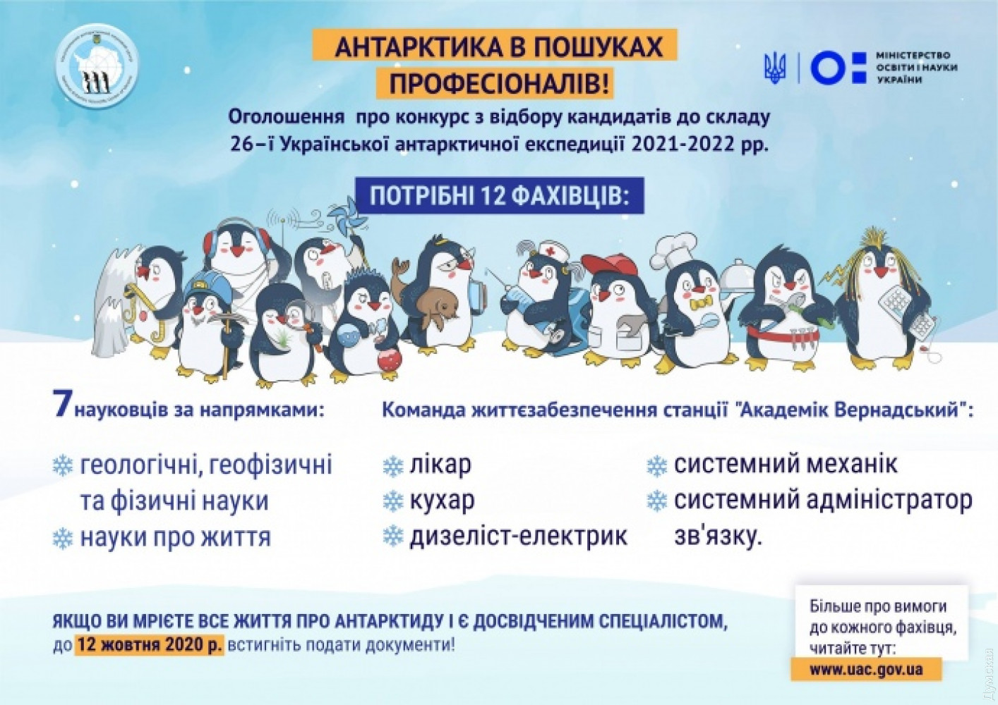 В Украине объявили конкурс на участие в 26-й Украинской антарктической экспедицииНациональный антарктический научный центр МОН объявил конкурс по отбору команды 26-й Украинской антарктической экспедиции. Об этом сообщила пресс-служба Минобразования. Как отметил директор НАНЦ Евгений Дикий, 26-я Украинская антарктическая экспедиция является своего рода юбилейной, потому что в 2021 году исполнится 25 лет со времени поднятия флага Украины на бывшей британской станции «Фарадей», которая теперь называется «Академик Вернадский». Он подчеркнул, что с учетом эпидемии COVID-19, при отборе будущих полярников и полярниц особое внимание будет уделяться физическому и психологическому здоровью кандидатов. Победители будут проводить научные исследования и обеспечивать жизнедеятельность станции «Академик Вернадский» в Антарктиде с весны 2021-го до весны 2022-го года. желающие могут подать документы до 12 октября 2020 года. Для экспедиции будет отобрано 12 участников. Помимо семи ученых, которые будут работать в сфере исследований геологических и геофизических наук, физических наук и науки о жизни, в экспедиции также есть вакансии врача, повара, дизелиста-электрика, системного механика и системного администратора связи. Отбор будет проходить в четыре этапа: - подача документов — до 12 октября включительно; - подача дополнительных документов в случае прохождения предварительного отбора — до 26 октября включительно; - профессиональное собеседование, медицинская комиссия и психологическое тестирование; - коллективный тренинг для тех, кто предварительно пройдет отбор в экспедицию. Подробнее с требованиями к каждому специалисту, условиями конкурса, уровнем оплаты труда и социальными гарантиями можно ознакомиться в официальном объявлении на сайте Национального антарктического научного центра. СМЕРТЬ РОССИЙСКИМ ОККУПАНТАМ! Заметили ошибку? Выделяйте слова с ошибкой и нажимайте control-enter |