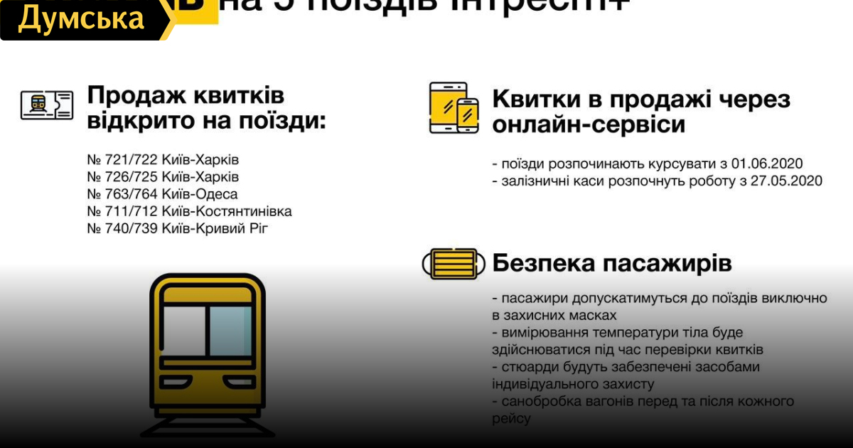 В Украине открыли продажу ж/д билетов на первые пять направлений, в том числе из Киева в Одессу«Укрзалізниця» открыла продажу билетов на первые пять направлений по Украине. Об этом сообщил министр инфраструктуры Владислав Криклий. Уже с сегодняшнего дня через онлайн-сервисы можно купить билеты на поезда «Интерсити+» по таким направлениям: Киев-Харьков (№721/722 и №726/725), Киев-Одесса (№763/764), Киев-Константиновка (№711/712) и Киев-Кривой-Рог (№740/739). Криклий отметил, что железнодорожные кассы начнут работать с 27 мая, а поезда будут курсировать с 1 июня. В Мининфраструктуры напомнили, что допускать пассажиров в вагоны будут только в масках, а во время проверки билетов всем людям будут измерять температуру. СМЕРТЬ РОСІЙСЬКИМ ОКУПАНТАМ! Помітили помилку? Виділяйте слова з помилкою та натискайте control-enter Новини по цій темі: 27 жовтня 2024: Через масштабну пожежу в Одесі стояли потяги: пасажири електрички не могли покинути вагони (оновлено) 16 жовтня 2024: Ні відліку від москви! В Одесі деколонізують залізничну станцію 24 вересня 2024: Утьосов проти Монатіка: зустрічати поїзди в Одесі буде все ж таки пісня «У Чорного моря» 9 червня 2024: Перебої з енергопостачанням змусили змінити графіки руху електропоїздів по всій Україні 24 листопада 2023: У 2024 році "Укрзалізниця" запустить 14 нових маршрутів |