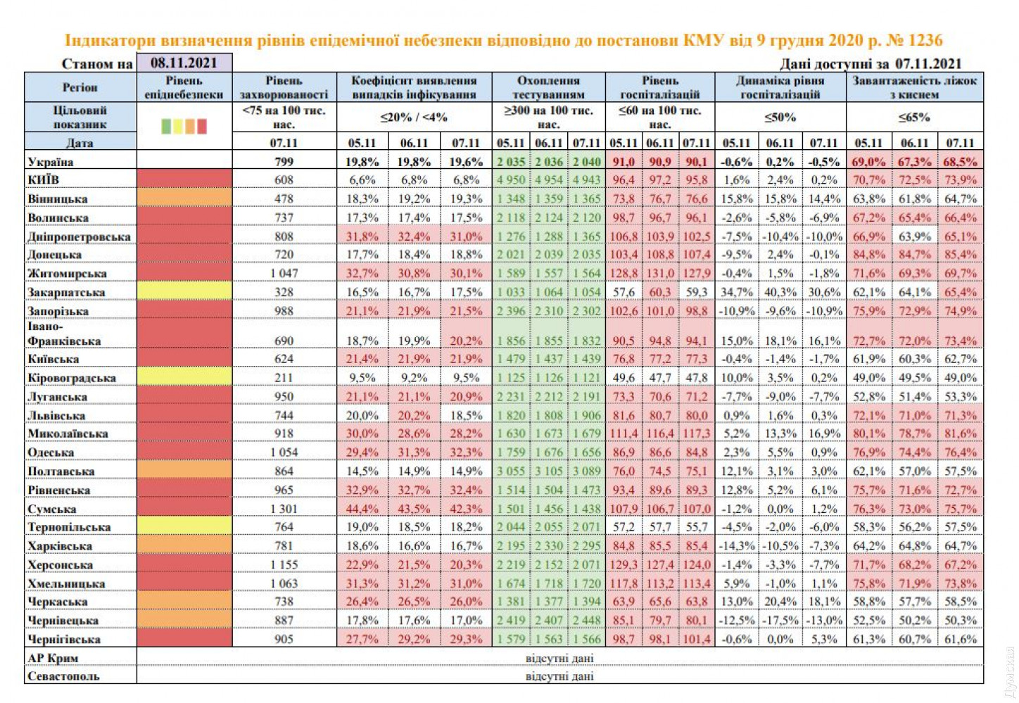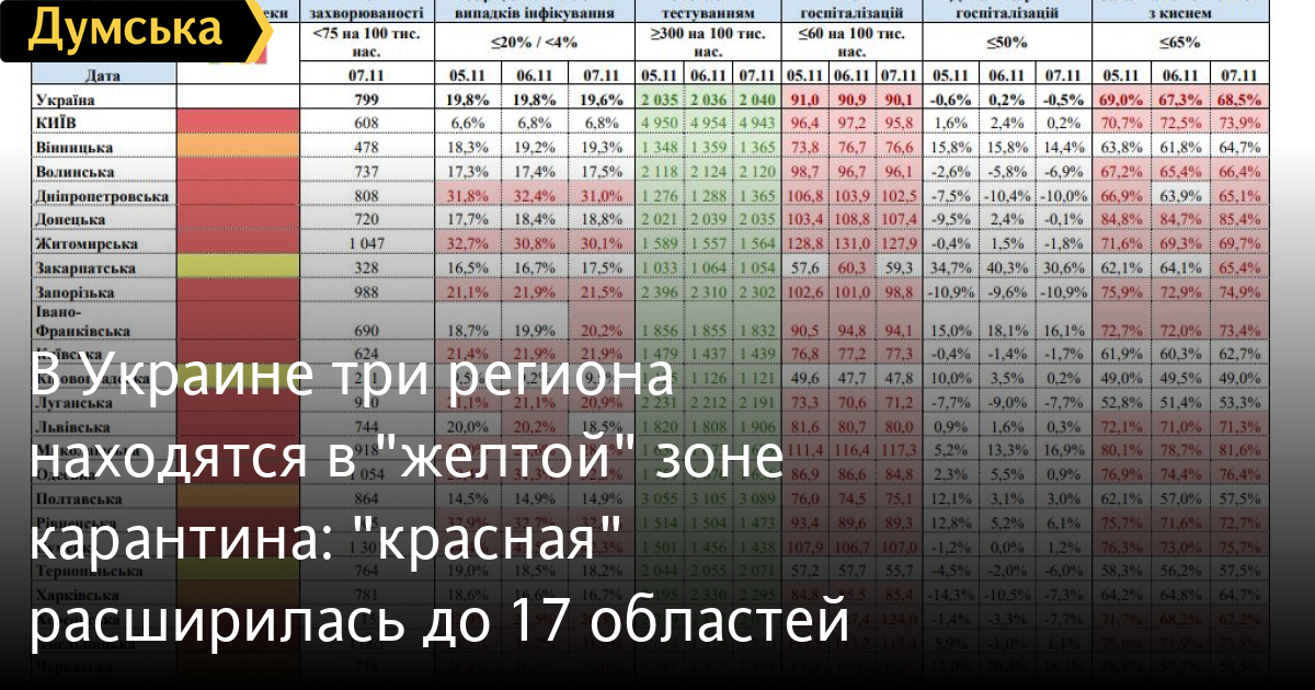 В Украине три региона находятся в «желтой» зоне карантина: «красная» расширилась до 17 областейПо состоянию на 8 ноября три региона Украины остались в «желтой» зоне карантина. Речь идет о Закарпатской, Кировоградской и Тернопольской областях. Как сообщает пресс-служба Минздрава, 17 регионов находятся в «красной» зоне. Речь идет о Херсонской, Одесской, Запорожской, Донецкой, Днепропетровской, Сумской, Николаевской, Ровенской, Житомирской, Ивано-Франковской, Киевской, Луганской, Хмельницкой, Черниговской, Львовской, Волынской областях и Киеве. В «оранжевой» зоне эпидемической опасности — Винницкая, Полтавская, Харьковская, Черкасская, Черновицкая области. Отметим, за прошедшие сутки в Украине выявлено 13 068 новых случаев заражения коронавирусной инфекцией. Скончались 7 ноября 473 пациента. СМЕРТЬ РОСІЙСЬКИМ ОКУПАНТАМ! Помітили помилку? Виділяйте слова з помилкою та натискайте control-enter |