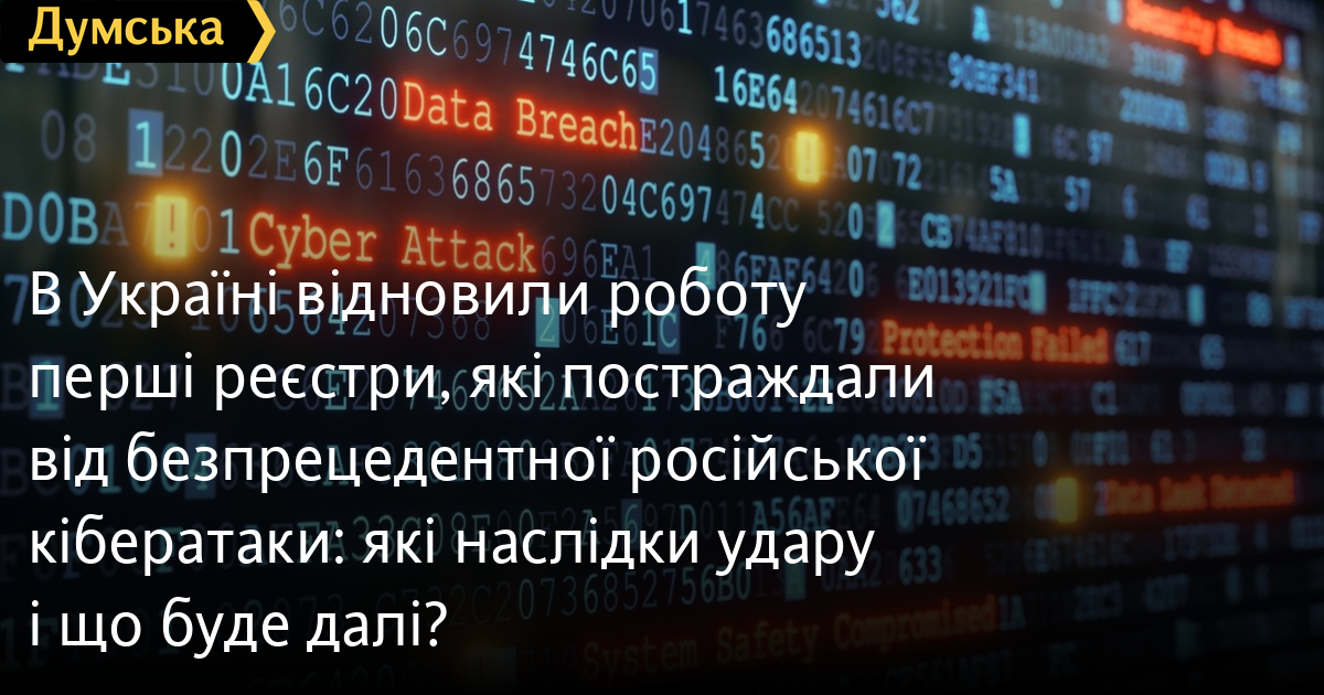 В Україні відновили роботу перші реєстри, які постраждали від безпрецедентної російської кібератаки: які наслідки удару і що буде далі?Три ключові нотаріальні реєстри України, які постраждали внаслідок кібератаки з боку росії, відновили роботу. Про це сьогодні повідомили в Міністерстві юстиції, передає кореспондент «Думської». Зокрема, знову функціонують Єдиний реєстр довіреностей, Спадковий реєстр та Єдиний реєстр спеціальних бланків нотаріальних документів. Тепер нотаріуси можуть повноцінно реєструвати довіреності, заповіти та спадкові справи, перевіряти спецбланки. Усі ті документи, що видали нотаріуси доки системи не працювали, мають занести до реєстрів протягом п'яти днів. Відновлені бази додатково захищені від нових кібератак, стверджують у Мін'юсті. ЩО СТАЛОСЯ? Наймасштабнішу за всю історію кібератаку на українські державні реєстри ворог здійснив 19 грудня. Російські хакери заявили, що знищили всі дані, до яких змогли дотягнутися, включно з резервними копіями на польських серверах. Примітно, що український уряд понад 12 годин відмовлявся визнавати факт атаки, стверджуючи, що має місце звичайний технічний збій. І тільки 20 грудня міністр юстиції Ольга Стефанишина офіційно заявила: таки хакери попрацювали. За даними Служби безпеки України, росіяни готували атаку не один місяць. Стоїть за нею хакерське угруповання головного розвідуправління генштабу рф - те саме, яке рік тому успішно знесло ядро найбільшого мобільного оператора України «Київстар». «Як правило, такі атаки відбуваються з комбінованим використанням фішингу, соціальної інженерії та можливим залученням інсайдерів, — прокоментували атаку «Економічній правді» в Інституті дослідження кібервійни. — Наразі невідомо, який період зловмисники перебували в системі. Але якщо якісь дані було видалено, то основне значення матиме свіжість бекапів даних із реєстрів. Ймовірно, метою хакерів могла бути паралізація державних послуг, збір розвідувальних даних і нанесення економічної шкоди». Сумарно хакерам вдалося видалити понад мільярд записів у шести десятках різних реєстрів. Крім того, у «Дії» недоступно 27 послуг. Серед знищених — Єдиний державний реєстр юридичних осіб, фізосіб-підприємців та громадських формувань, реєстр обтяжень нерухомого майна, Держреєстр речових прав на нерухоме майно, Єдиний реєстр боржників, Єдиний реєстр довіреностей, Єдиний реєстр заповітів та спадкових прав, Єдиний реєстр підприємств, щодо яких розпочато процедуру банкрутства, база актів цивільного стану. З 20 грудня нотаріуси позбавлені можливості виконувати більшість своїх функцій і здебільшого лише завіряють документи. ЧИМ ЦЕ ЗАГРОЖУЄ? Наслідки знищення реєстрів дуже серйозні. Фактично заблоковано всі операції з нерухомістю, купа проблем з оформленням та отриманням спадщини, реєстрацією та перереєстрацією підприємств, тендерними процедурами. Немає можливості укладати багато фінансових угод, подати заяву на соціальні виплати, перевірити контрагента. Одруження, розлучення, народження і смерті реєструються тільки на папері. Багато хто побоюється, що внаслідок кібератаки може втратити своє майно. Однак опитані «Думською» експерти вважають, що до такого не дійде. «Усе-таки, незважаючи на величезну роль, яку відіграють у нашому житті електронні реєстри, угоди завжди офор