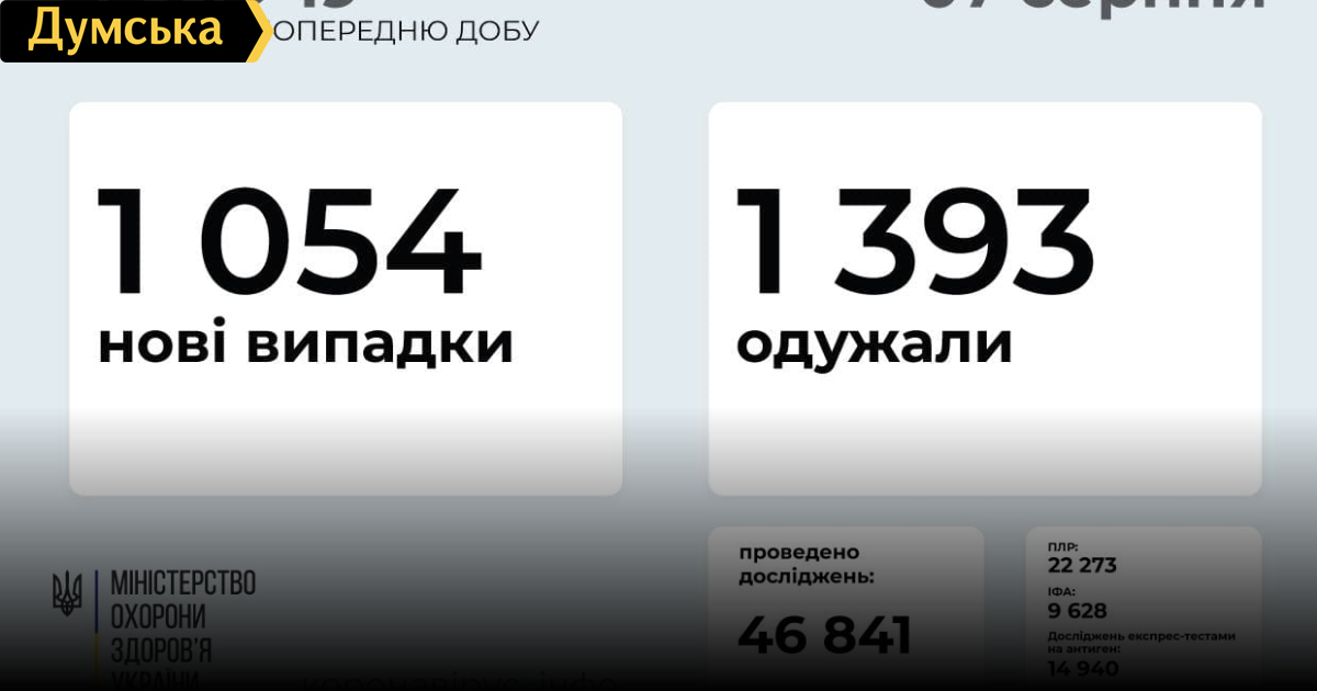 1054 инфицированных COVID-19 выявили 6 августа в Украине. С начала пандемии «ковидом» заболели уже 2258532 украинца. В Минздраве сообщили о 20 летальных исходах от осложнений инфекции за минувшие сутки (всего 53085). 1393 украинцев вчера вылечились от «ковида» (2190686), по стране «ковидные» больницы загружены на 9% (3492 койки из 38919). Первую дозу вакцины накануне получили 101550 человек (4055090), вторую – 69052 (2353218). СМЕРТЬ РОСІЙСЬКИМ ОКУПАНТАМ! Помітили помилку? Виділяйте слова з помилкою та натискайте control-enter Новини по цій темі: |