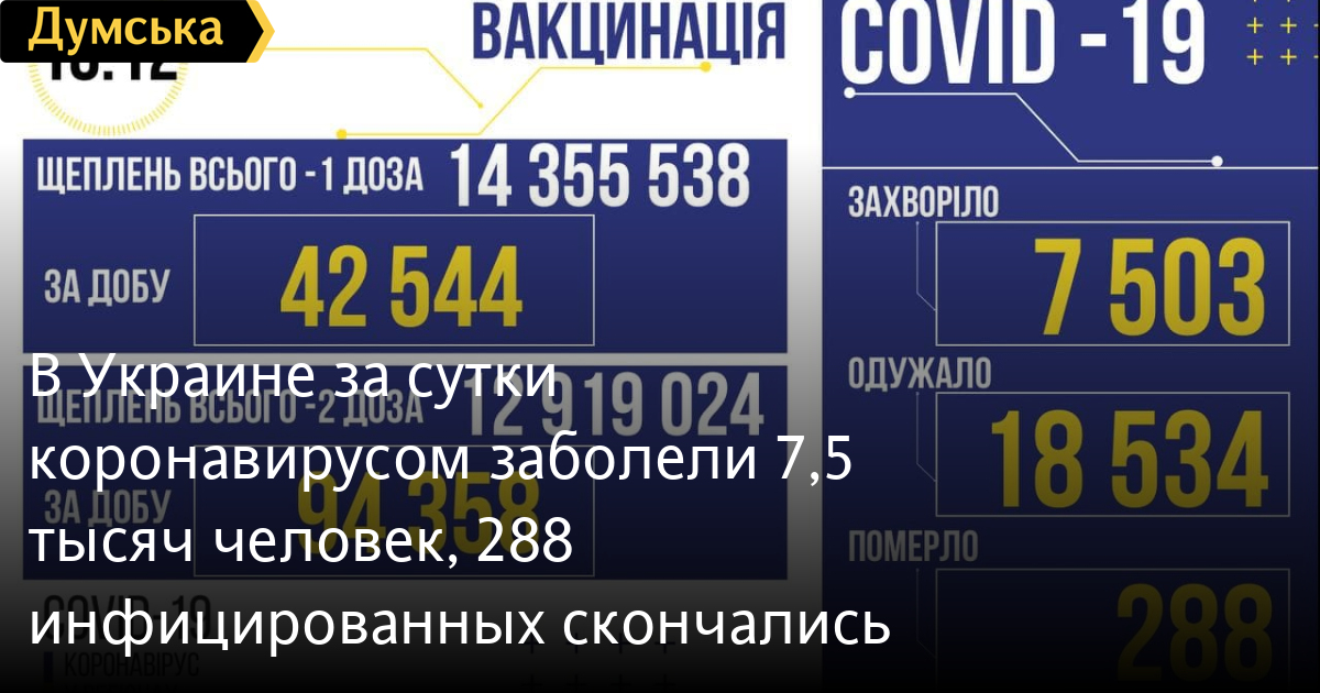 В Украине за сутки коронавирусом заболели 7,5 тысяч человек, 288 инфицированных скончались7503 новых случая заболевания коронавирусом зафиксировали 17 декабря в Украине. За все время в стране заразились ковидом 3604549 человек. В Министерстве здравоохранения сообщили, что вчера от осложнений инфекции умерли 288 пациентов (92929). 18534 человека выздоровели (3324999). По стране ковидные госпитали загружены на 31,1% (23099 коек из 74357). Первую дозу вакцины вчера получили 42544 человека (14355538), вторую – 94358 (12919024). СМЕРТЬ РОСІЙСЬКИМ ОКУПАНТАМ! Помітили помилку? Виділяйте слова з помилкою та натискайте control-enter Новини по цій темі: 4 березня 2023: "Вакцини-довгожителі", або Як щеплення проти COVID-19 перетворилися в Україні на небезпечний ритуал 27 січня 2023: МОЗ зобов`язали опублікувати договори на закупівлю вакцин проти COVID-19: апеляційний суд задовольнив позов журналіста "Думської" 11 січня 2023: За тиждень в Одесі зафіксовано 159 випадків ковіду 4 січня 2023: За тиждень в Одесі зареєстровано 113 випадків ковіду |