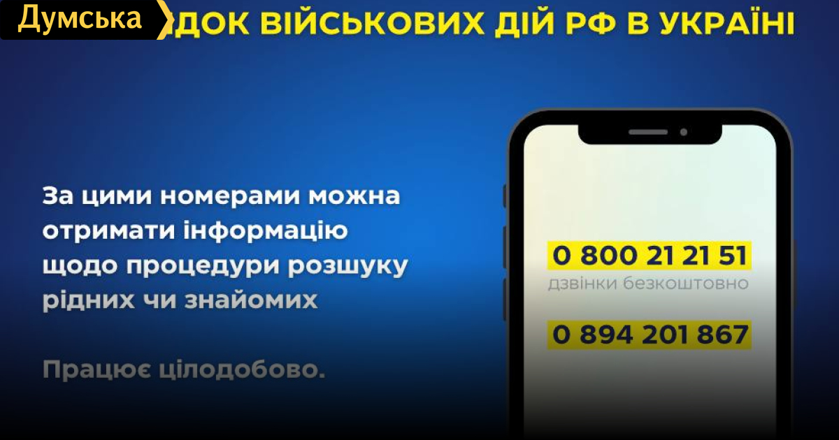 В Украине запустили еще одну спецлинию для поиска пропавших без вести в результате полномасштабного военного вторжения рф в нашу страну. Об этом сообщила пресс-служба Нацполиции Украины. Позвонив на горячую линию 0800212151, можно получить информацию относительно поиска родных или знакомых, пропавших или погибших вследствие российской агрессии. Звонки бесплатные и принимаются операторами круглосуточно. Напомним, что в Украине работает номер горячей линии (16-48; 044-287-81-65) Национального информационного бюро при Министерстве реинтеграции. Операторы линии помогают в поиске пропавших украинских военных и мирных жителей, которые находятся в плену рф. Кроме того, можно обратиться на горячую линию уполномоченного по правам человека (0800 50 17 20). СМЕРТЬ РОСІЙСЬКИМ ОКУПАНТАМ! Помітили помилку? Виділяйте слова з помилкою та натискайте control-enter |