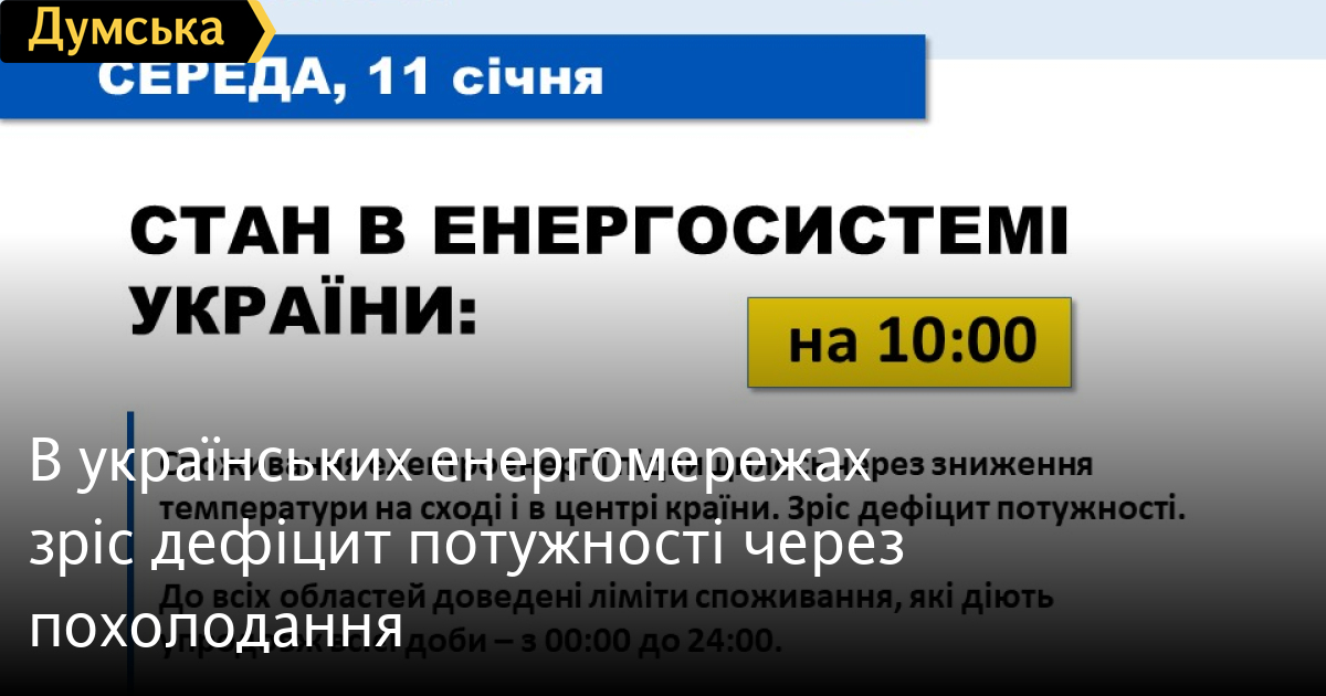 Уранці 11 січня через зниження температури повітря в центральних і східних регіонах України в енергомережах зріс дефіцит потужності.