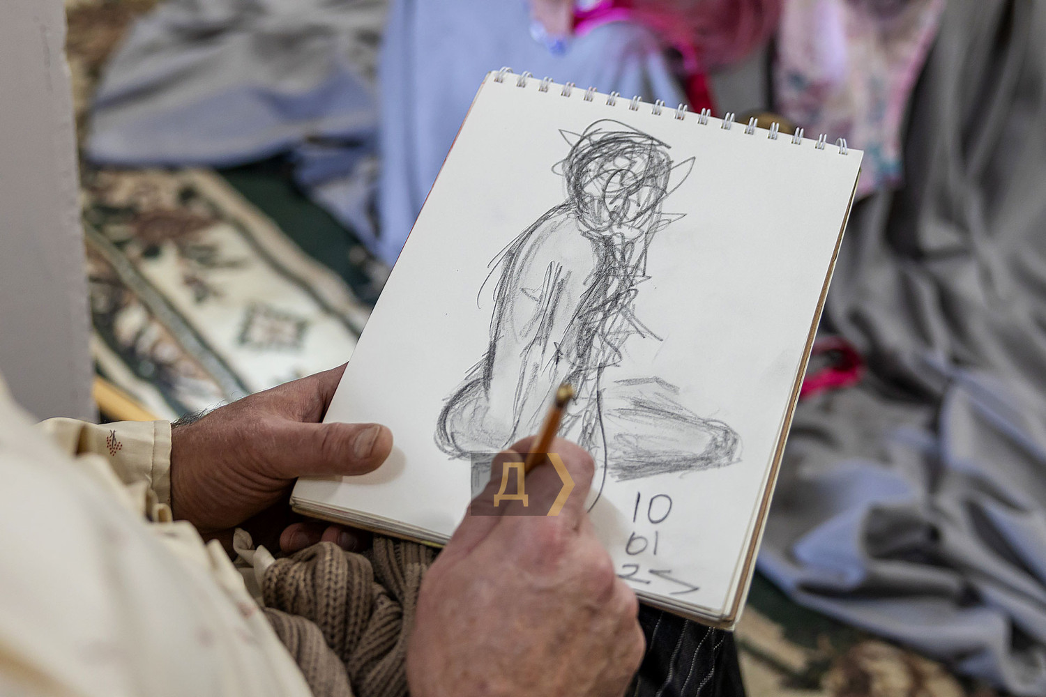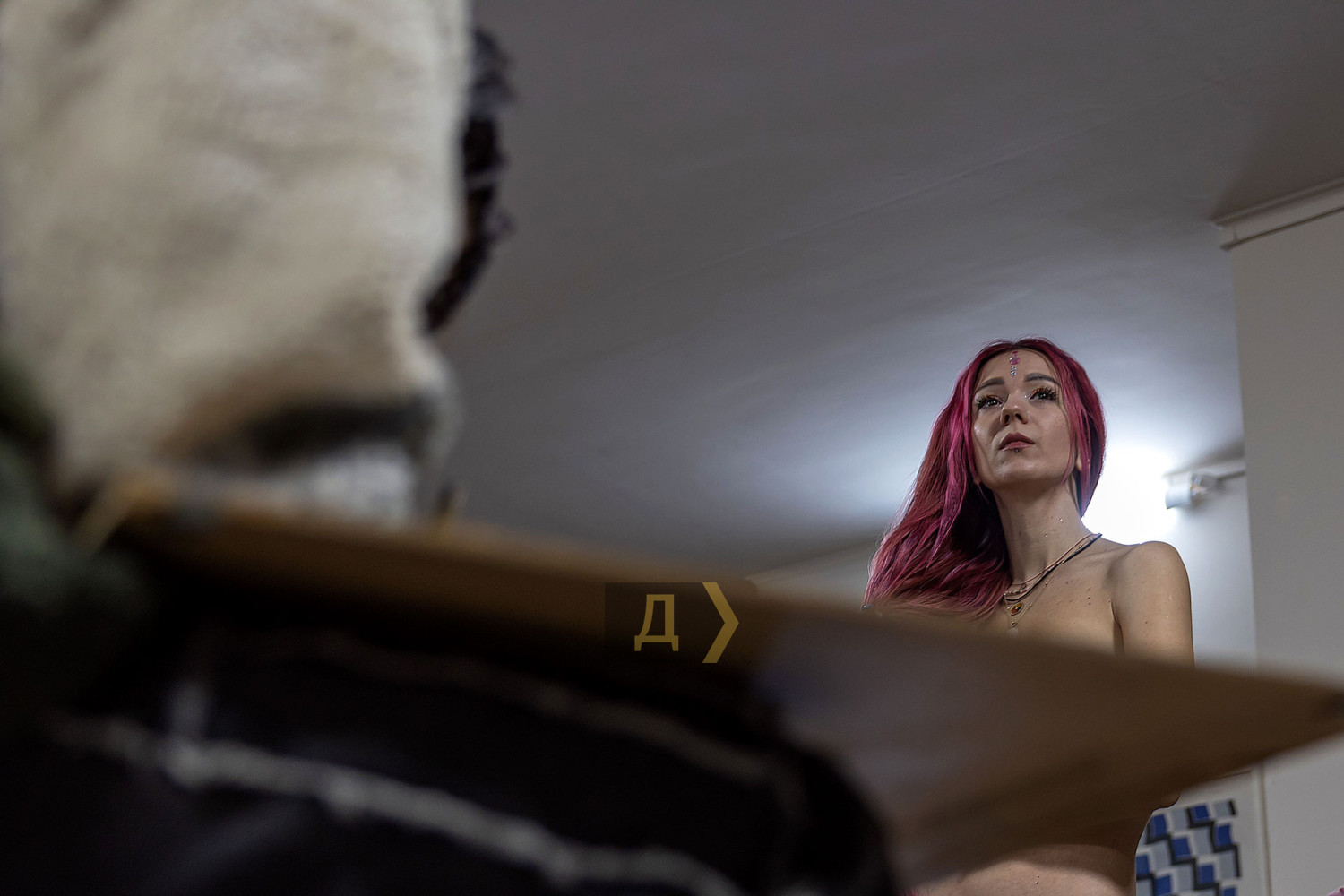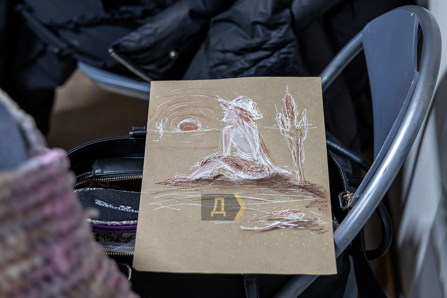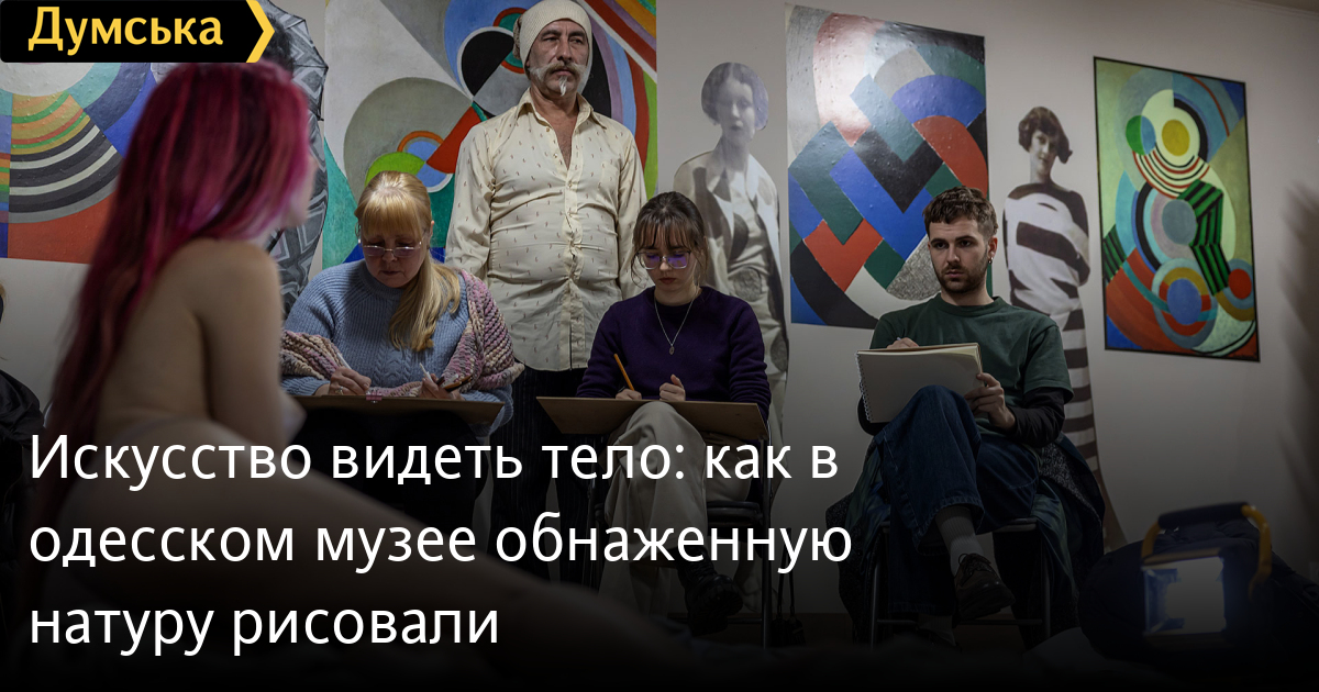 Рисование обнаженной натуры — обязательная база для художника. Без навыка передачи формы живого человеческого тела невозможно стать настоящим мастером, каким бы ни был выбранный стиль. В Одессе работа с натурой — часть учебного процесса во всех профильных заведениях: в Грековке, в Одесской государственной академии строительства и архитектуры, и на худграфе «Педина». К своему стыду, «Думская» ни разу не бывала на подобных занятиях. В год своего совершеннолетия, на 18-м году существования мы решили исправить это досадное упущение и заглянули в музей современного искусства, где также проходят подобные занятия. Слово — нашему корреспонденту Денису Меркурьеву. Занятие проходит в укрытии — на минус первом этаже. Со стен смотрит экспозиция, посвященная Сони Делоне — одесситке, художнице и дизайнерке, чье имя вписано в историю авангарда. Спуск в укрытие прегражден красно-белой сигнальной лентой — мероприятие камерное, только для зарегистрировавшихся. Пока ведущий занятия, одесский художник и дизайнер Владимир Уманенко расставляет стулья и расстилает ковер в центре зала, в помещение впархивает невысокая стройная девушка в ярком дутом костюме — будто с горнолыжного склона. Это Екатерина Ивашинникова, натурщица. Успеваю задать несколько вопросов — и она скрывается в соседней комнате, чтобы подготовиться к работе. Сессия будет длиться два часа с перерывами. За это время модель меняет три-четыре позы. Нужно сидеть, стоять или лежать, почти не двигаясь. Начинаю издалека, интересуюсь насколько сложно не менять позу столько времени. «Это не так сложно, как вы думаете, — рассказывает Екатерина. — Никто не заставляет сидеть в неудобной позе. Если устала — можно походить, размяться». Следующий вопрос уже более интимный: трудно ли раздеваться перед незнакомыми людьми? «Я работаю натурщицей уже третий год, а вообще в моделинге с подросткового возраста, — признается девушка. — Сложно только в первый раз. Потом исчезает стеснение: здесь нет ничего зазорного, это нормальная художественная практика. В академиях так учат десятилетиями». В зал понемногу спускаются участники — люди разного уровня и опыта. Владимир Уманенко поясняет формат: «Это не академический класс и не студия для студентов. Сюда приходят художники, дизайнеры, врачи, юристы — люди разных профессий. Кто-то не рисовал со школы, а кто-то приходит почти на каждую сессию. Моя роль — не учить, а быть тьютором: подсказать, если человек сам этого хочет». Спустя пять минут из отдельной комнаты выходит модель. Образ Екатерины под стать ярким принтам Сони Делоне — розовые волосы водопадом струятся к осиной талии, прикрывая аккуратную грудь, на щеках — россыпь блестящих веснушек, на лбу — украшение из граненых камней, на голове — шляпка. Один из художников вслух отмечает красоту фигуры модели — и тут же получает мягкое, но четкое замечание от ведущего: подобные комментарии здесь неуместны. Это рабочее пространство, а не обсуждение внешности. Уманенко спрашивает участников — стоит ли оставлять шляпу. Гости мероприятия соглашаются, что головной убор придает оголенной фигуре интересный акцент. Класс начинает работать. У каждого свой подход: карандаш или пастель, работа с цветом с первых штрихов, бумага или цифровой планшет. Рисовать нужно быстро — схватывать форму, а не «вылизывать» 
