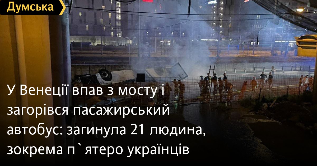У Венеції впав з мосту і загорівся пасажирський автобус: загинула 21 людина, зокрема п`ятеро українцівП'ятеро громадян України загинули внаслідок смертельної ДТП за участю пасажирського автобуса, яка сталася у Венеції вночі 3 жовтня. Про це повідомив представник Міністерства закордонних справ Олег Ніколенко в коментарі УНІАН. «За наявною інформацією, туристичний автобус із 40 пасажирами зірвався з естакади і впав із висоти близько 30 метрів. Наразі відомо про п'ятьох загиблих українців, ще троє травмовані. Наразі їм надається необхідна медична допомога в лікарні», — зазначив Ніколенко. За інформацією ЗМІ, 50-річна жінка та чотирирічна дівчинка, які є українськими громадянами, зазнали серйозних опіків і зараз перебувають у важкому стані. Італійські ЗМІ повідомляють, що автобус компанії La Linea працював на метані. За попередньою версією, він з'їхав із проїжджої частини, пробив огорожу і, пролетівши близько 30 метрів, опинився біля залізничних колій. Імовірно, автобус зачепив електропроводи і загорівся. В автобусі, крім українців, були громадяни Німеччини, Франції та Хорватії. Мер Венеції Луїджі Бругнаро розпорядився оголосити міську жалобу в пам'ять про численні жертви. Помітили помилку? Виділяйте слова з помилкою та натискайте control-enter Новини по цій темі: 30 серпня 2025: Машина вилетіла в кювет: мер Рені потрапив в аварію, його мати загинула, а маленький син у лікарні (фото) 18 серпня 2025: Троє загинули, один у лікарні: на трасі Одеса-Рені водій Mercedes не пропустив фуру (фото) 28 липня 2025: П'яний на "Ягуарі" або гіпертонік? Звільнений топ-посадовець одеської поліції хоче повернутися на службу 2 квітня 2025: В Одесі водій BMW спровокував аварію, в якій постраждали п`ятеро людей, і втік (фото, відео) |