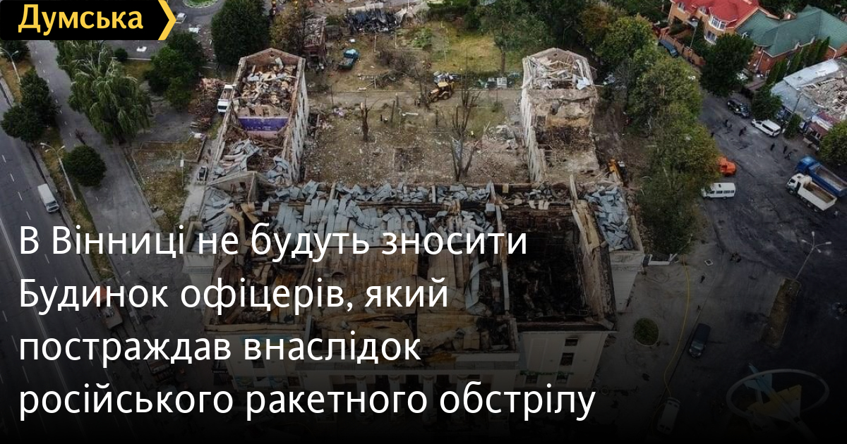 «Після влучання ракети будівля є аварійною. Такий висновок ДСНС. Після обстеження фахівцями, було прийнято рішення про розбір завалів.Мова не про знесення всього об’єкту, а про демонтаж аварійних конструкцій, де небезпечно. Будинок офіцерів вистояв Другу світову війну. Вистоїть і цю - він уже став символом стійкості Вінниці», — зазначив посадовець.