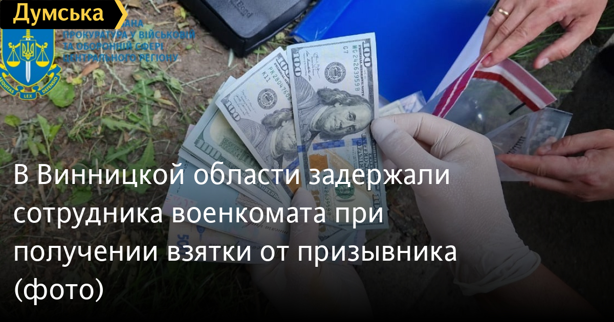 По данным региональной спецпрокуратуры в военной и оборонной сфере, задержанный, майор Вооруженных сил Украины, требовал у призывника 1400 долларов и 3550 грн за непривлечение к военной службе.