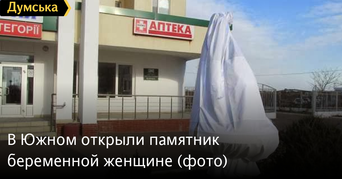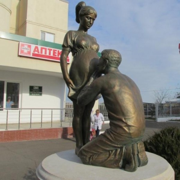 Памятник беременной женщине открыли на территории Южненской городской больницы. Скульптурная композиция называется «Трое» и состоит из двух фигур – беременной женщины и стоящего перед ней на коленях мужчины.