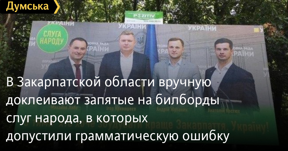 Накануне в Закарпатской области появились билборды с четырьмя местными нардепами от «Слуги народа». Лозунг на рекламе написан с грамматической ошибкой – не хватает запятой перед союзным словом «кто». Ошибку заметил местный журналист Виталий Глагола. После его замечания, сегодня на борды начали вручную доклеивать запятую.